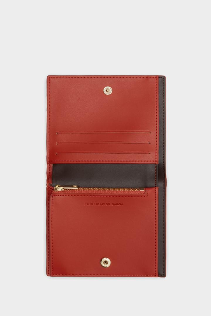 Cartera japonesa en piel con estampado Gutenberg bicolor. Cierre de solapa con broche e interior a contraste con tres ranur…