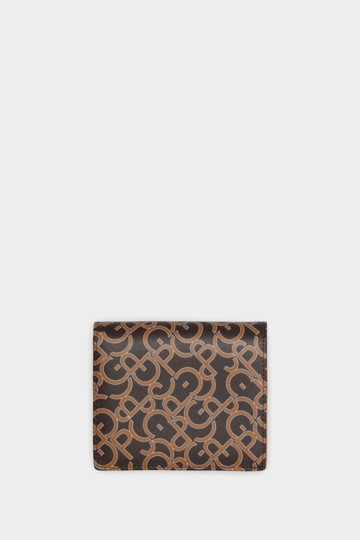 Cartera japonesa en piel con estampado Gutenberg bicolor. Cierre de solapa con broche e interior a contraste con tres ranuras para tarjetas, un compartimento para billetes y monedero con cierre de cremallera.