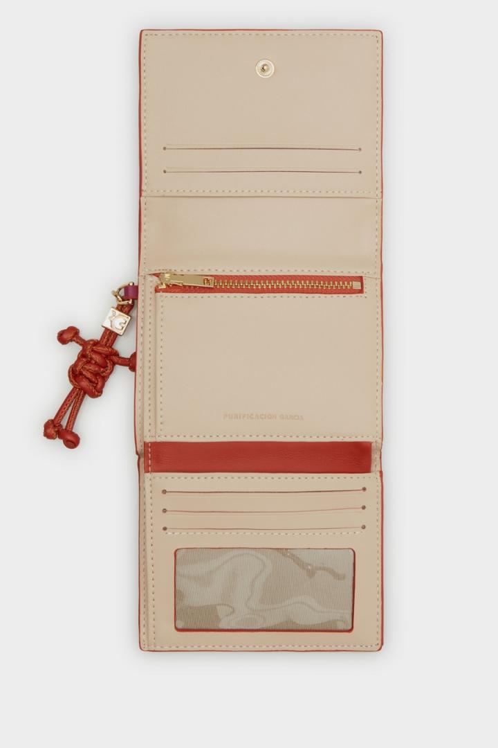 Cartera japonesa en piel con diseño geométrico y logo PG pespunteado. Cierre de solapa con broche. Interior con monedero y ranuras para tarjetas. Incluye charm de piel a contraste con diseño anudado en forma de Cubi.