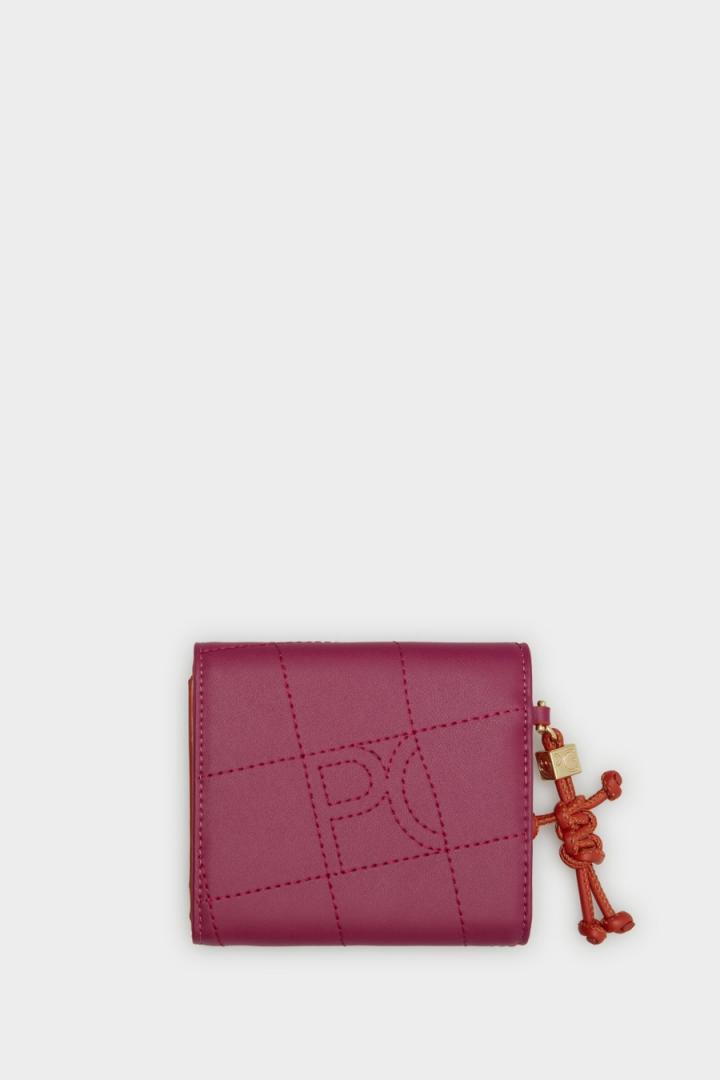 Cartera japonesa en piel con diseño geométrico y logo PG pespunteado. Cierre de solapa con broche. Interior con monedero y ranuras para tarjetas. Incluye charm de piel a contraste con d…