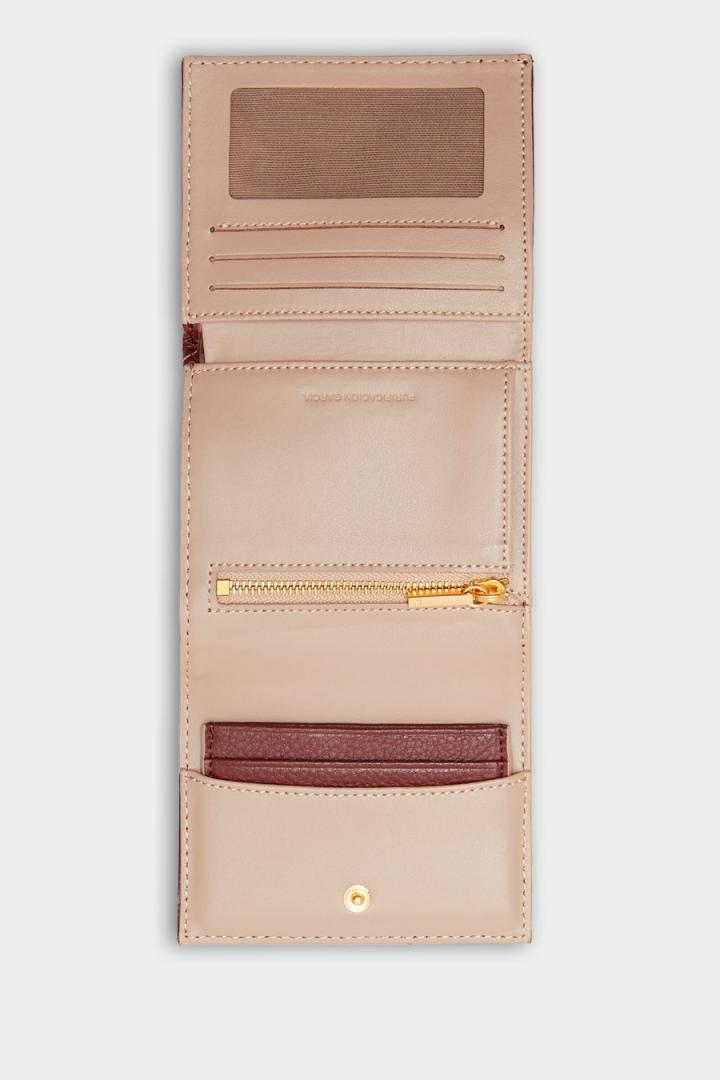 Cartera japonesa de piel con diseño geométrico y pespuntes a contraste. Cierre de solapa. Interior con monedero, billetera, 3 ranuras para tarjetas y tarjetero extraíble.