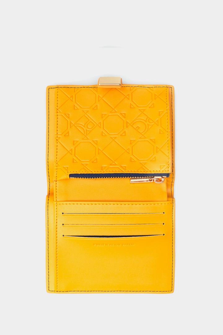 Cartera japonesa de piel con con grabado geométrico Granada y logos PG. Cierre de tira con metálica de cubo PG. Interior con monedero, billetera y 3 ranuras para tarjetas.