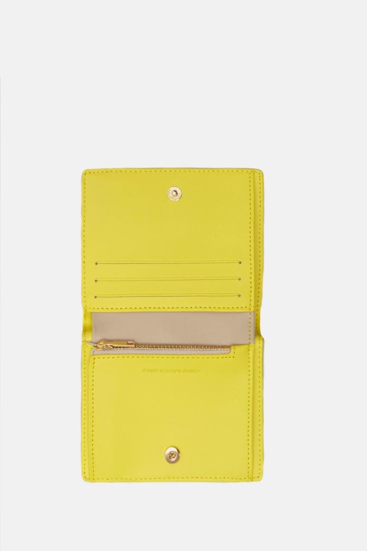 Cartera japonesa en piel con detalle de cubo PG metálico. Cierre de broche e interior a contraste con monedero, billetera y 3 ranuras para tarjetas.