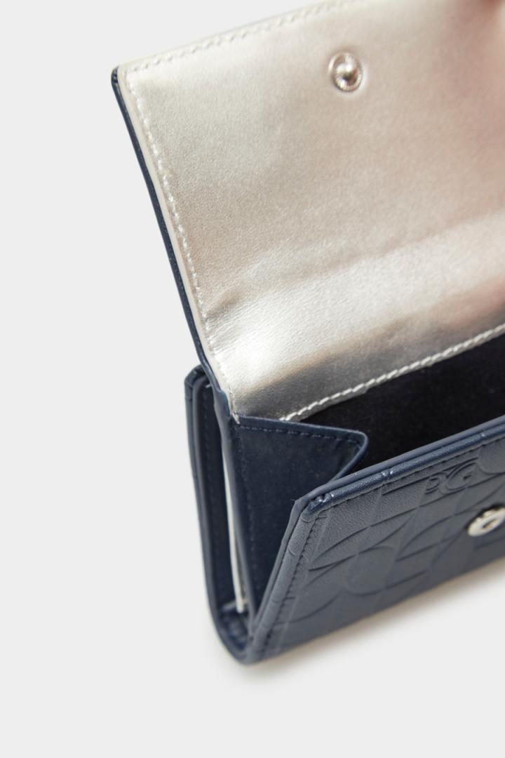 Cartera japonesa en piel con grabado PG Bauhaus y detalle de lazo. Cierre de solapa con broche e interior con monedero, billetera y cuatro ranuras para tarjetas.