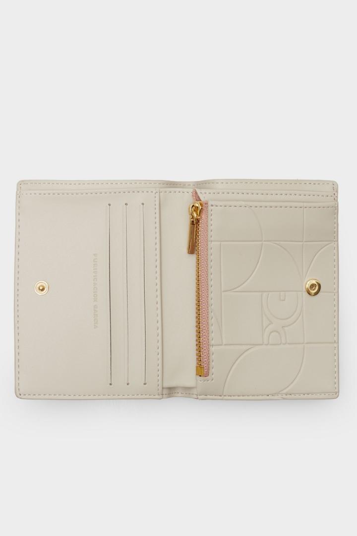 Cartera japonesa en piel con detalle de lazo en el exterior y grabado PG Bauhaus en el interior. Cierre de broche e interior a contraste con monedero, billetera y 3 ranuras para tarjetas.