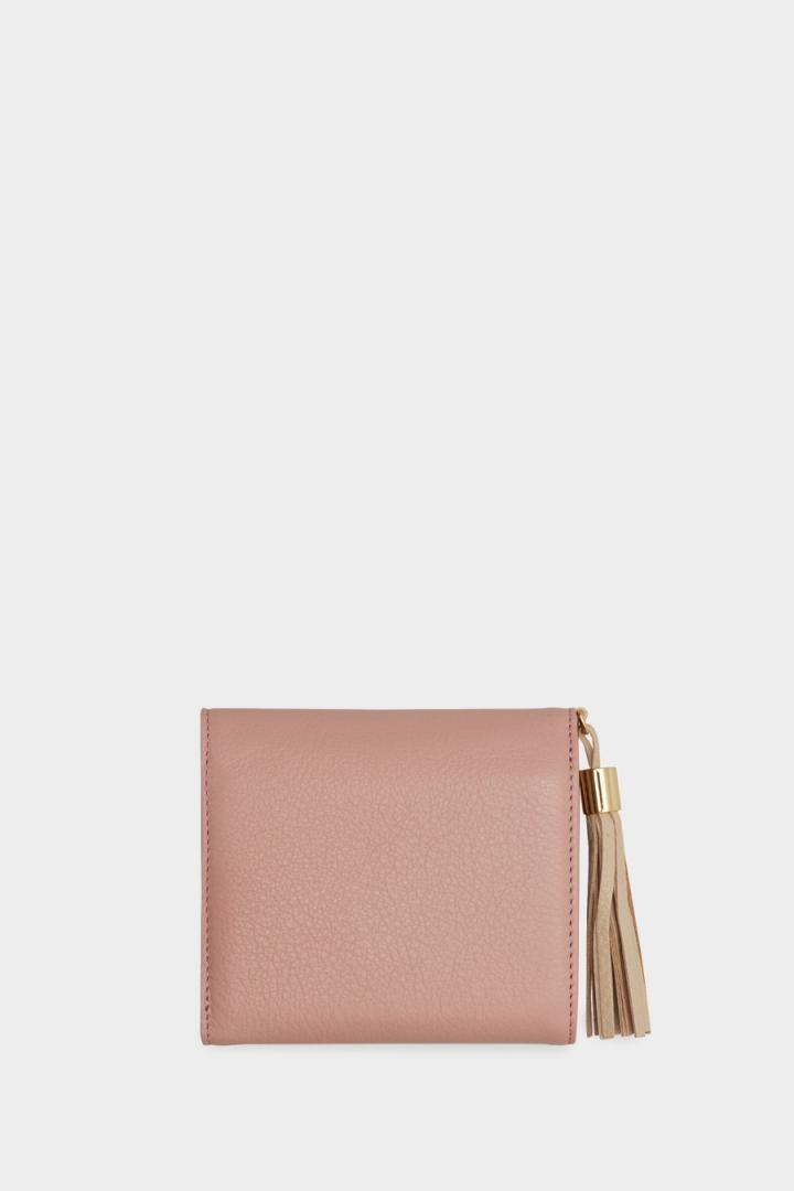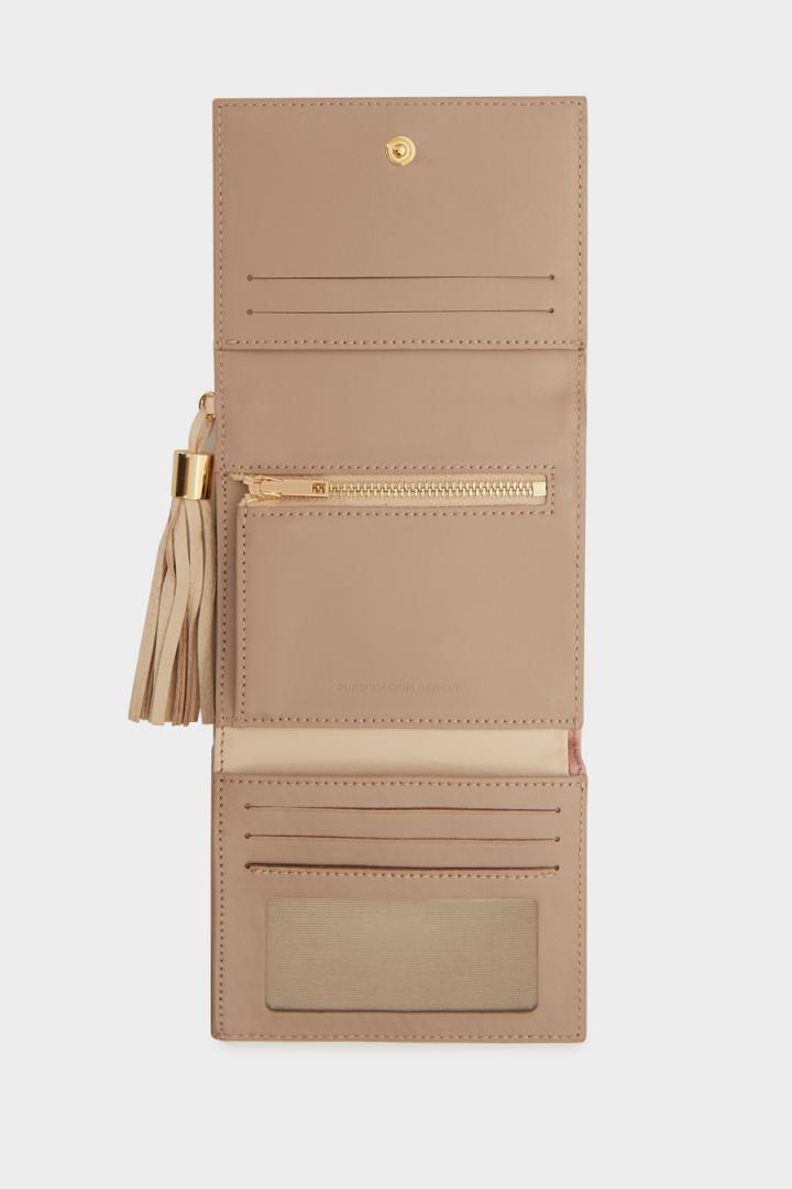 Cartera japonesa de piel con detalle de borla a tono. Cierre de solapa con logo PG metálico. Interior con tarjetero extraíble, monedero y 3 ranuras para tarjetas.