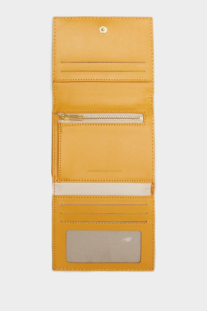 Cartera japonesa de piel con diseño geométrico y grabado Stamp de micro cubos y logos PG. Cierre de solapa y detalle de logo PG metálico. Interior con tarjetero extr…