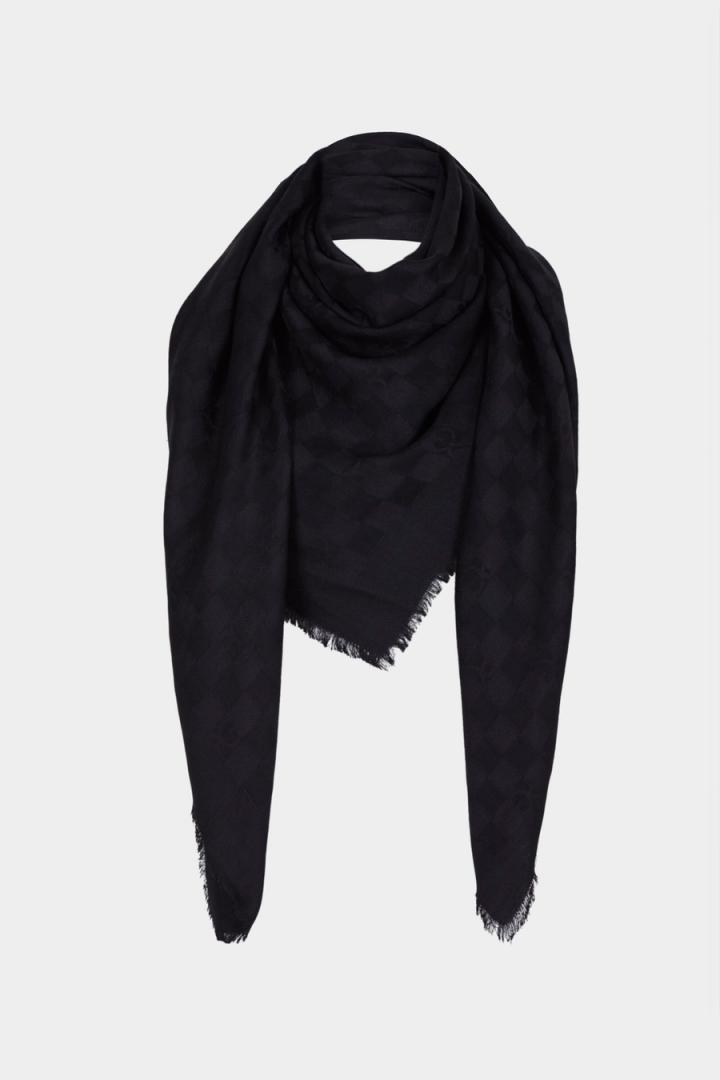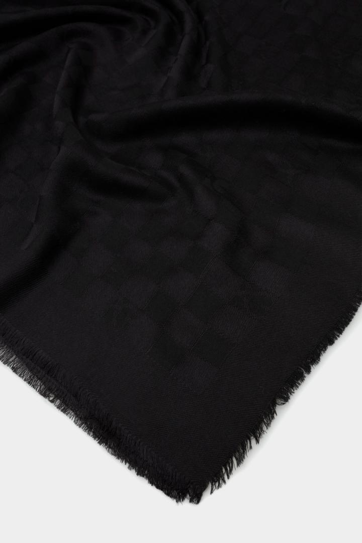 Chal en mezcla de seda y lana con jacquard de cubos y logos PG. Acabado desflecado.