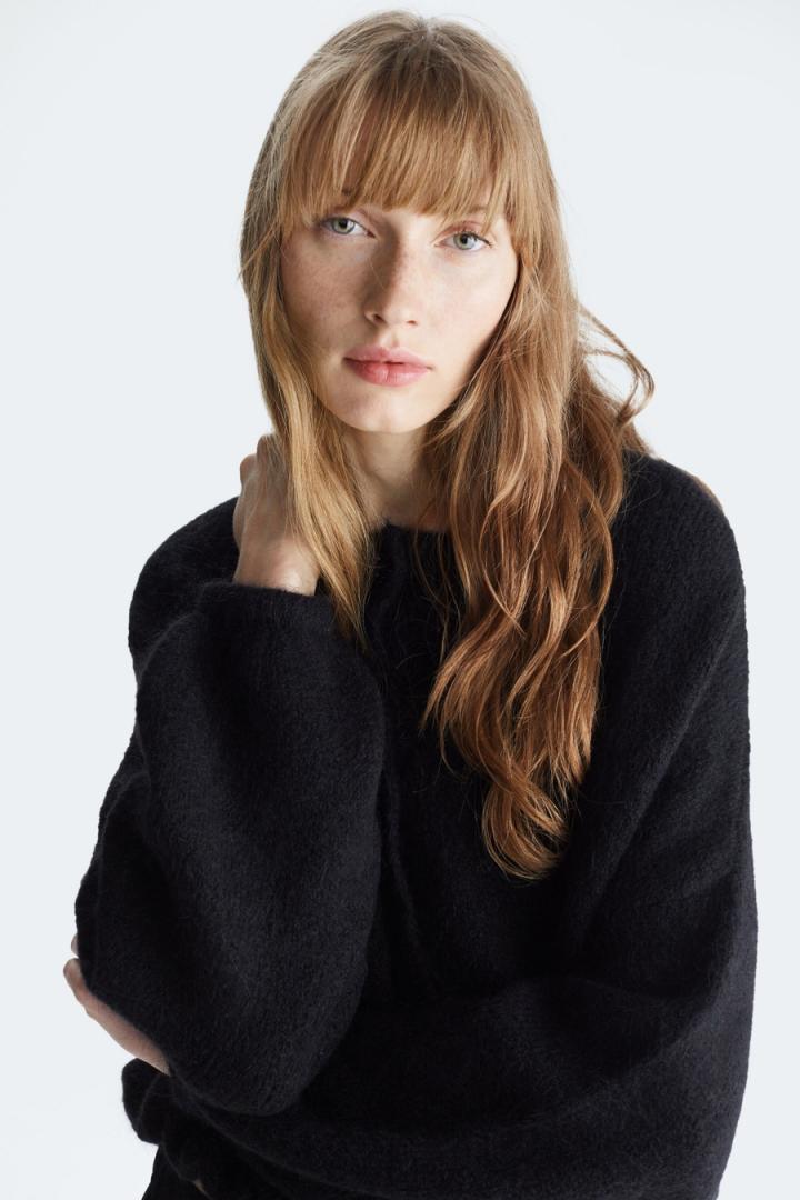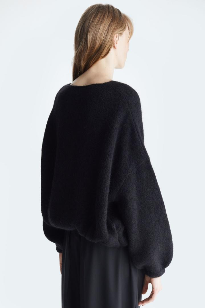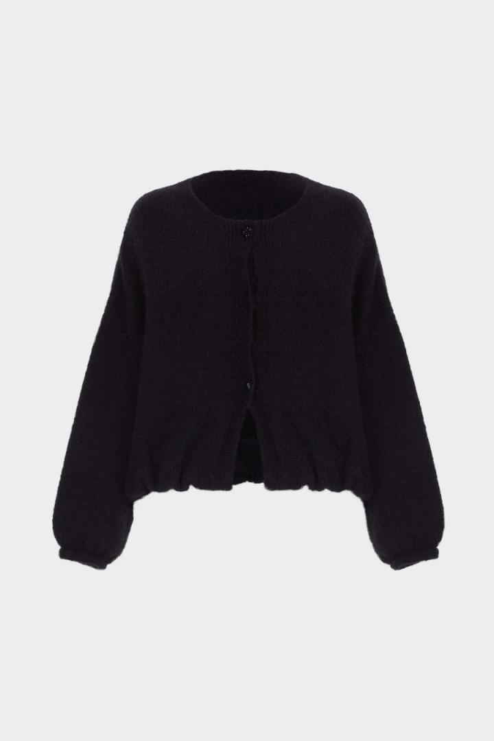 Chaqueta bomber de línea cocoon en punto de mezcla de mohair y lana. Cuello redondo, cierre de botones y hombro caído. Manga abullonada con puño ajustado y bajo asimétrico fruncido. La modelo mide 178 cm y lleva una talla S.