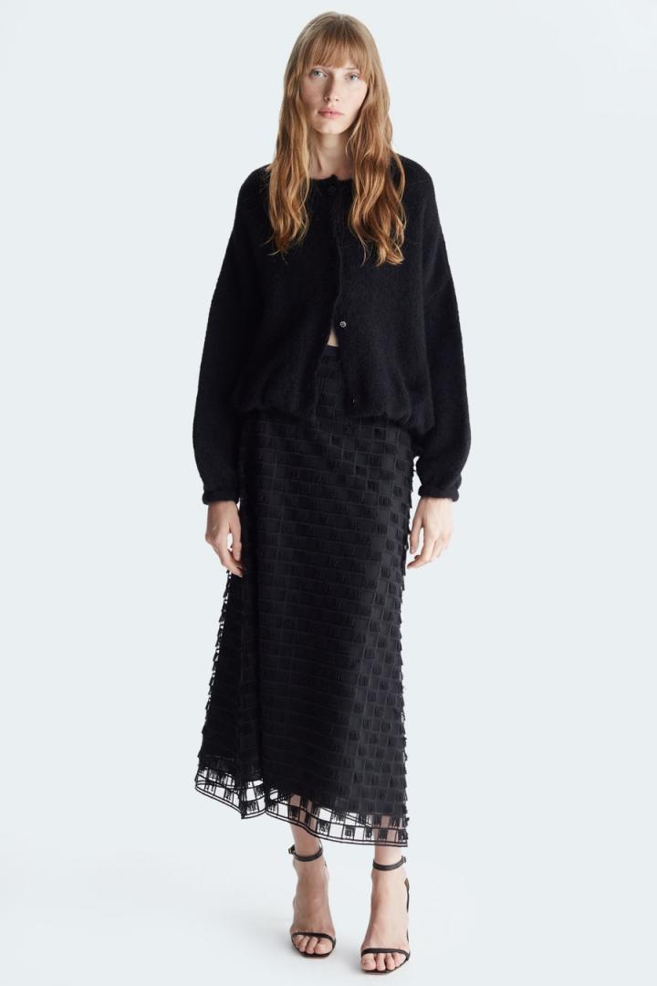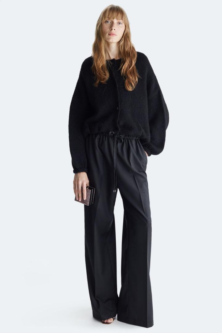 Chaqueta bomber de línea cocoon en punto de mezcla de mohair y lana. Cuello redondo, cierre de botones y hombro caído. Manga abullonada con puño ajustado y bajo asimétrico fruncido. La modelo mide 178 cm y lleva una talla S….