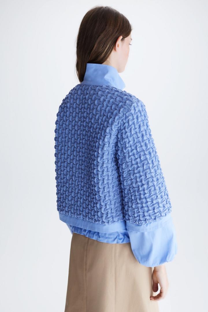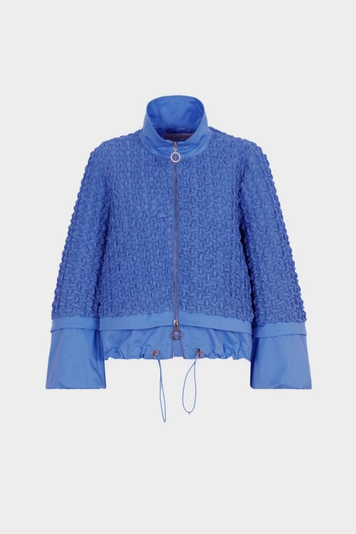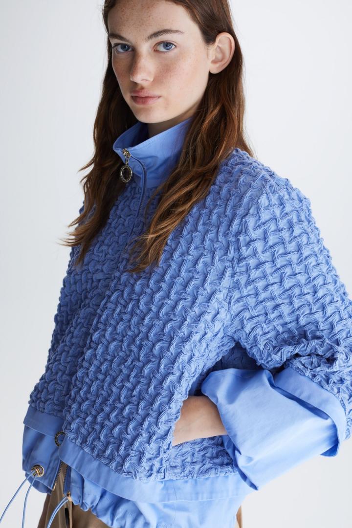 Chaqueta de línea cocoon combinada con frontal, espalda y mangas en tejido gofrado y cuello, puños y bajo en algodón a tono. Cuello tira, cierre de cremallera de doble cursor con tiradores personalizados y manga larga ligeramente abullonada con puños ajustados. Bajo regulable con fruncidores. La modelo mide 178 cm y lleva una talla XS.
