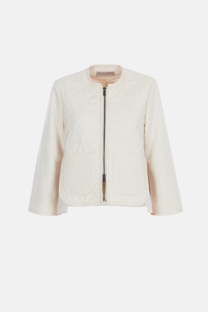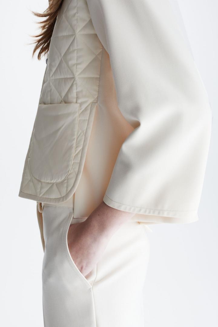 Chaqueta corta de línea evasé en doble tela con delantero en tejido técnico con acolchado Pop Origami y largo asimétrico. Cuello redondo, cierre de cremallera de doble cursor y dos bolsillos parche. Manga francesa ancha y aberturas laterales. La modelo mide 178 cm y lleva una talla XS.