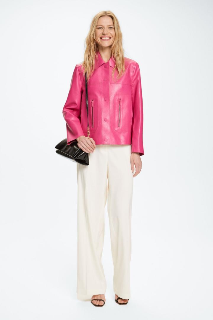 Chaqueta corta de línea recta en ecopiel. Cuello camisero, cierre de broches lacados a tono y bolsillos frontales con cremallera y tirador personalizado. La modelo mide 176 cm y lleva una talla S.
