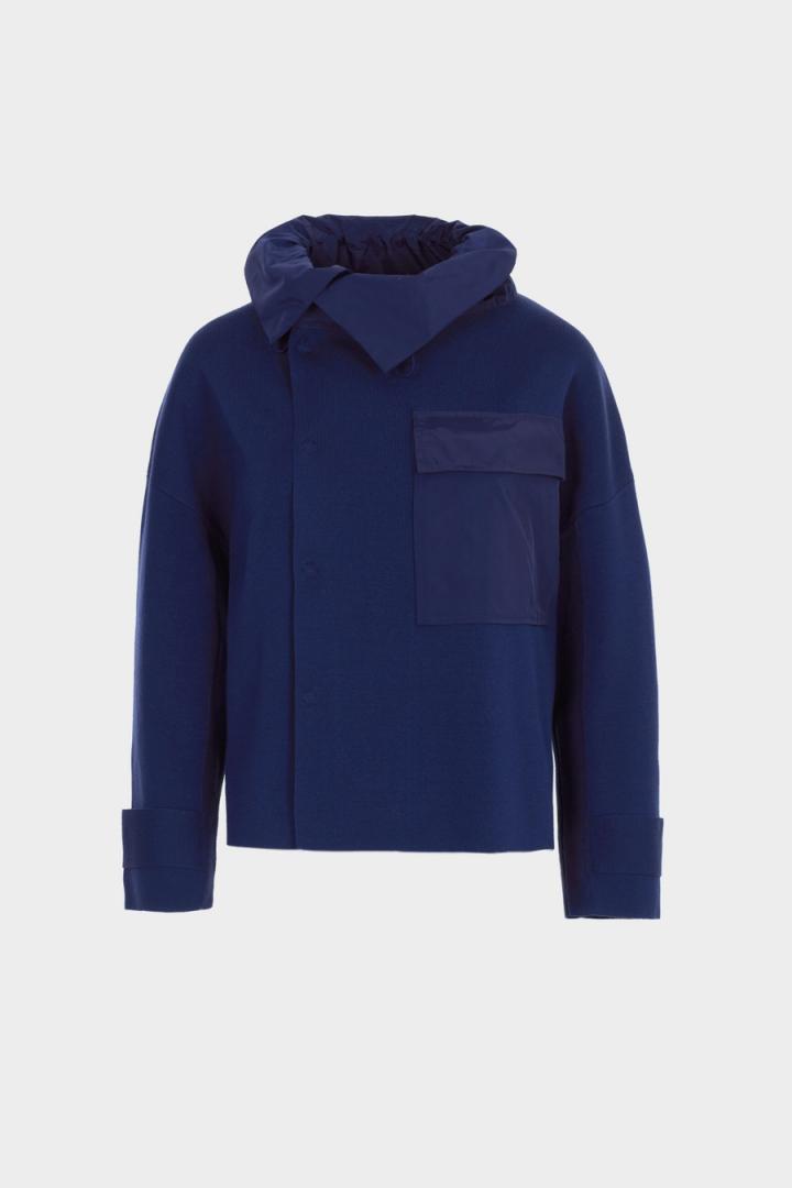 Chaqueta corta de línea recta en punto stretch con cuello y bolsillo en nylon a tono. Cuello tira vuelto y ajustable con cordones elásticos y reguladores metálicos y cierre cruzado con doble fila de broches ocultos. Hombro caído, manga larga recta y maxi bolsillo parche con tapeta en el pecho. Detalle de trabillas con broche oculto en los puños y logo PG metálico en la espalda. La modelo mide 180 cm y lleva una talla S.