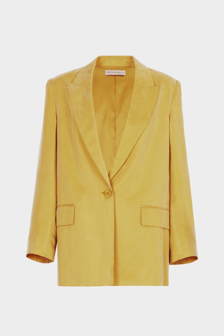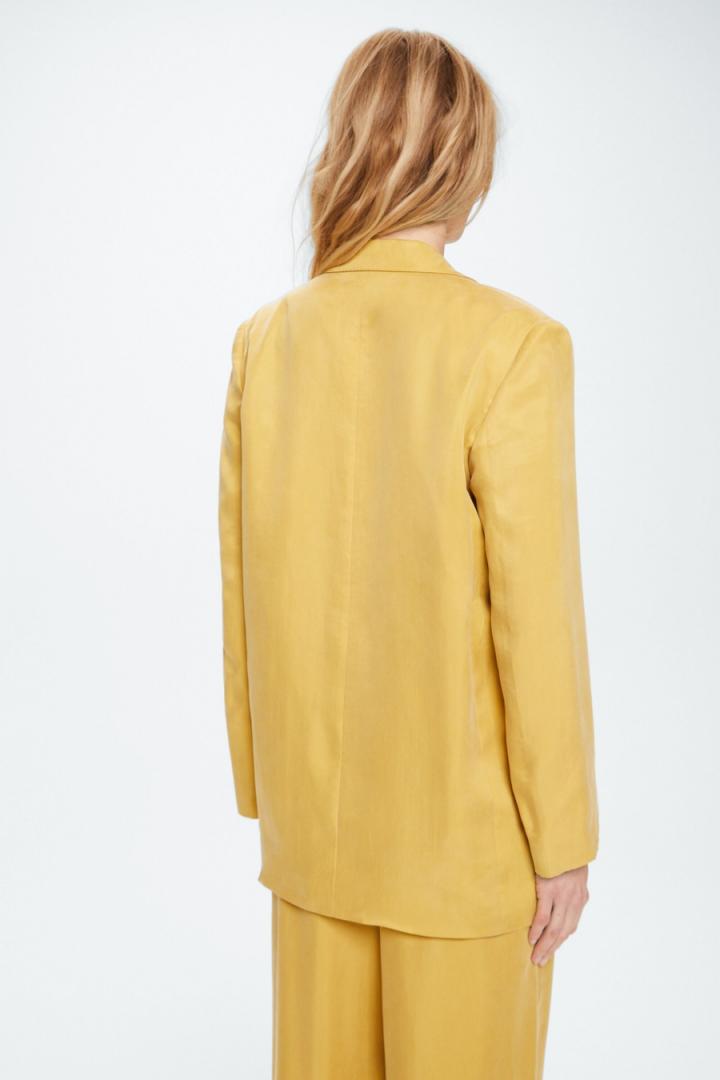 Chaqueta sastre de línea recta en cupro de liocel. Cuello con solapa, manga con hombrera, cierre de un botón a tono y dos bolsillos con tapeta. Tiene pantalón a conjunto. La modelo mide 176 cm y lleva una talla 36.