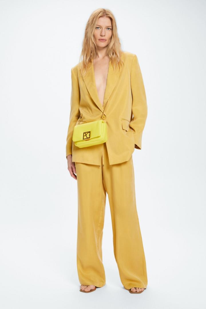 Chaqueta sastre de línea recta en cupro de liocel. Cuello con solapa, manga con hombrera, cierre de un botón a tono y dos bolsillos con tapeta. Tiene pantalón a conjunto…