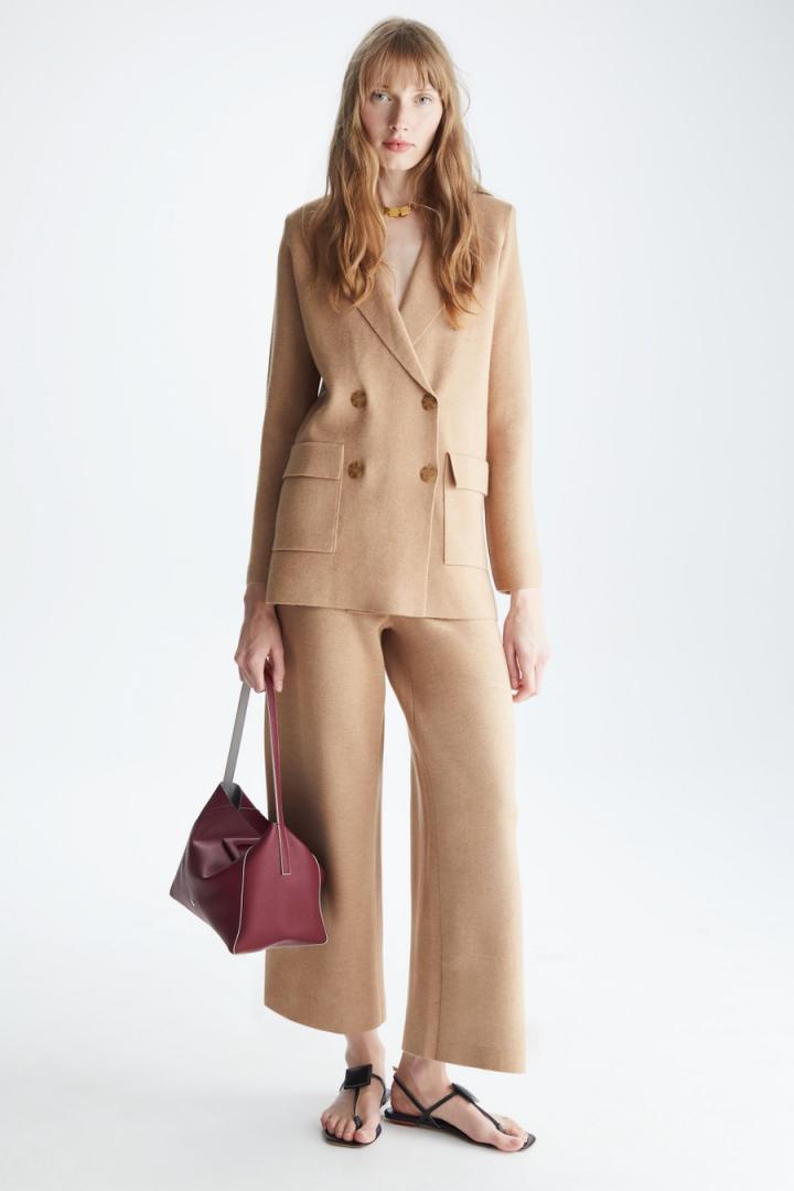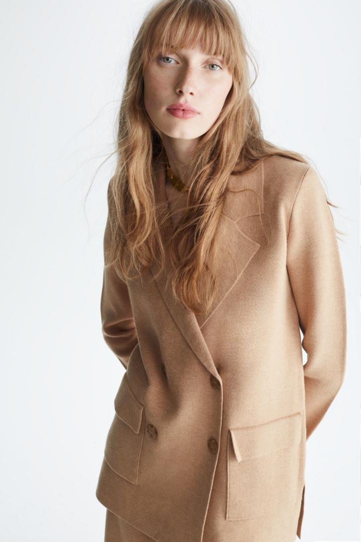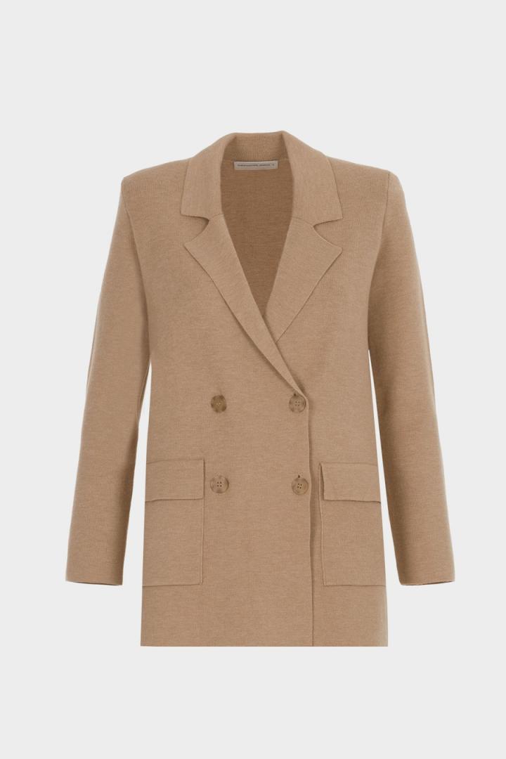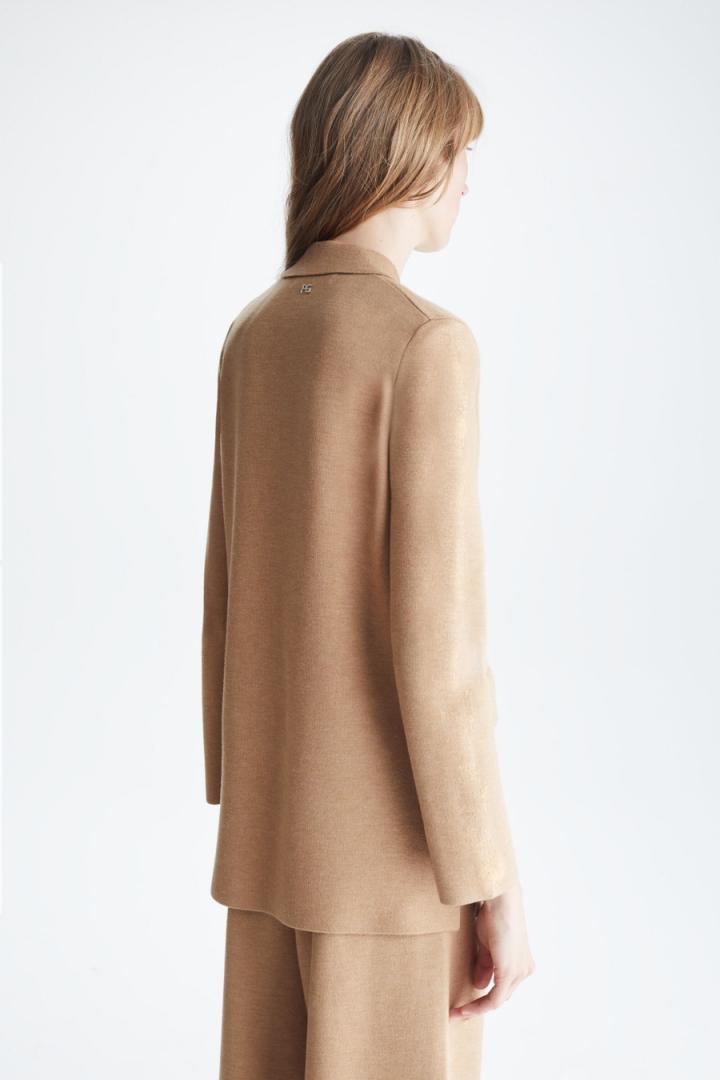 Chaqueta sastre de línea recta en punto stretch doble faz. Cuello con solapa, manga con hombrera, cierre cruzado de doble botón a tono y dos bolsillos con tapeta. Tiene pantalón a conjunto. La modelo mide 178 cm y lleva una talla S.