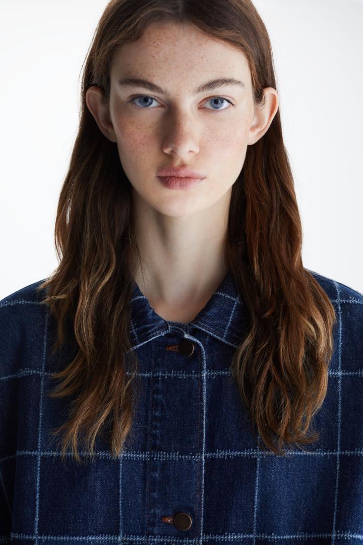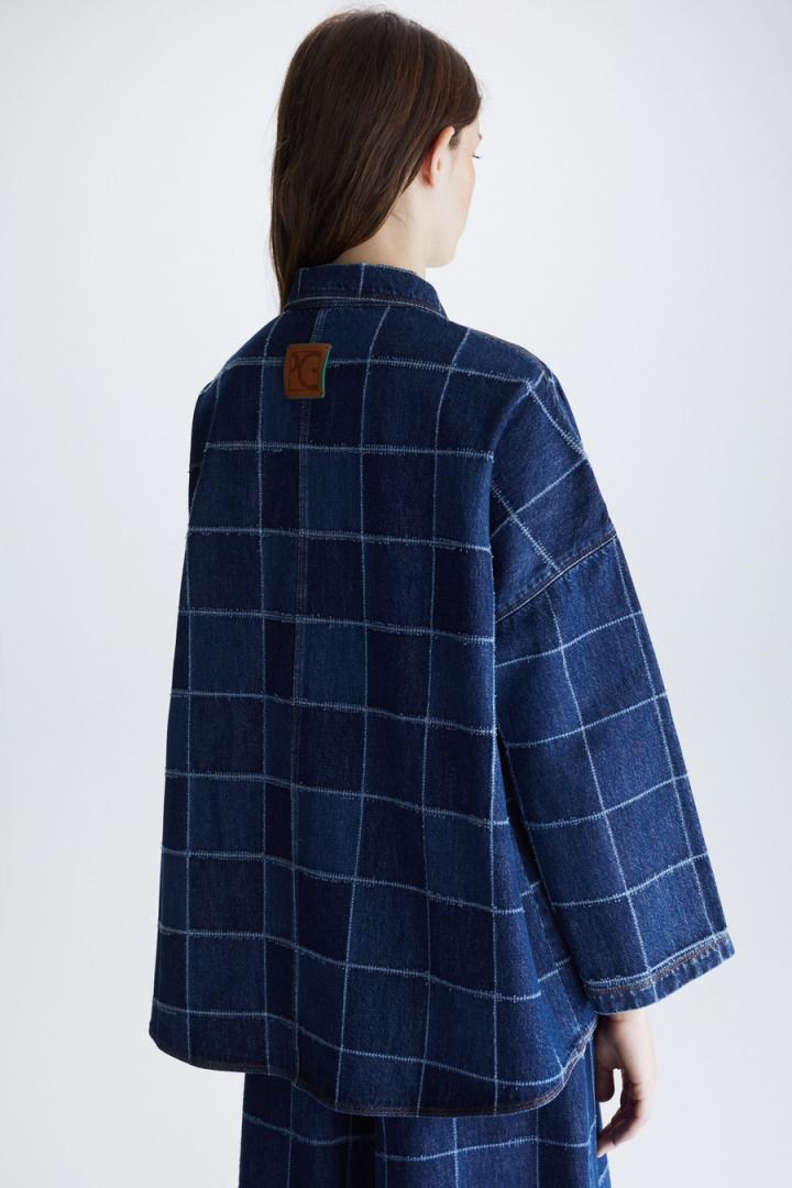 Chaquetón de línea oversize en denim de algodón con diseño de cubos con ribetes desflecados. Cuello camisero, cierre de botones personalizados y dos bolsillos parche con tapeta. Manga larga amplia, pespuntes a contraste y parche de piel con C…