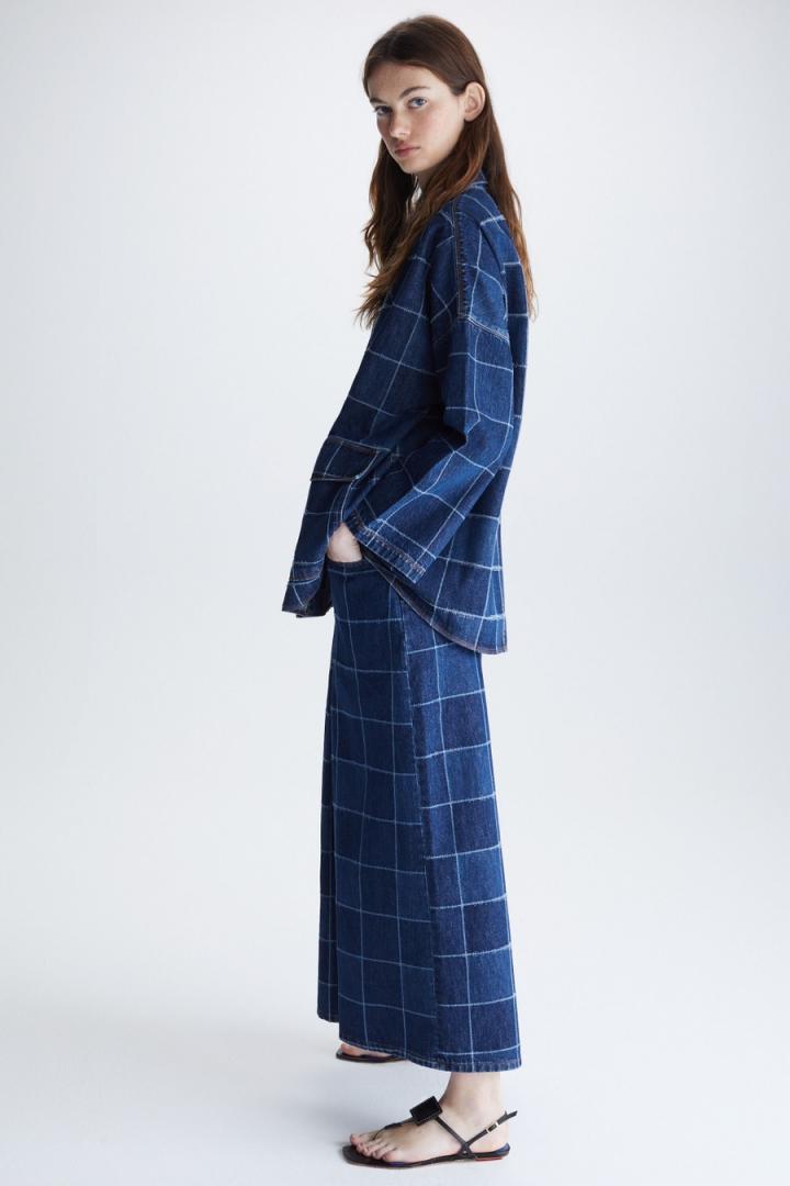 Chaquetón de línea oversize en denim de algodón con diseño de cubos con ribetes desflecados. Cuello camisero, cierre de botones personalizados y dos bolsillos parche con tapeta. Manga larga amplia, pespuntes a contraste y parche de piel con Cubo PG en la espalda. Tiene falda pantalón a conjunto. La modelo mide 178 cm y lleva una talla XS.