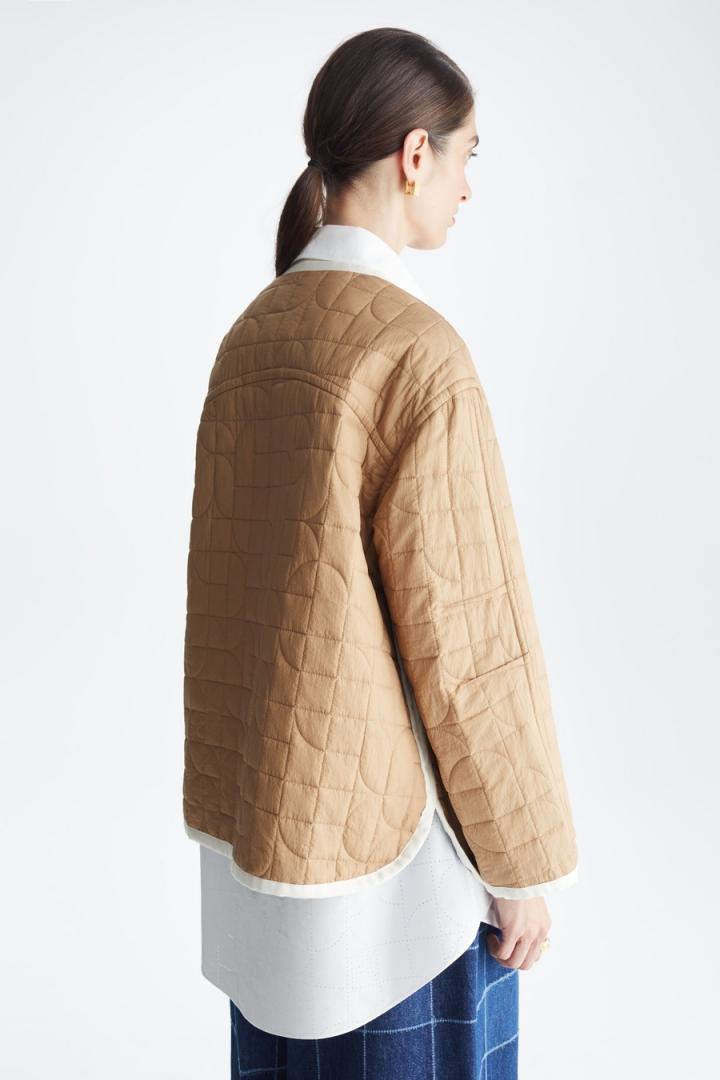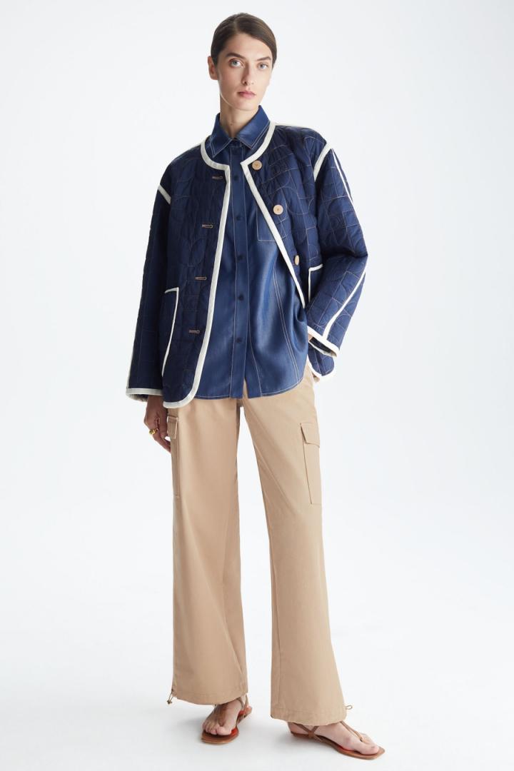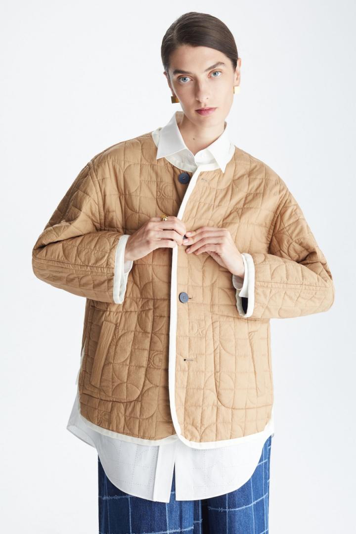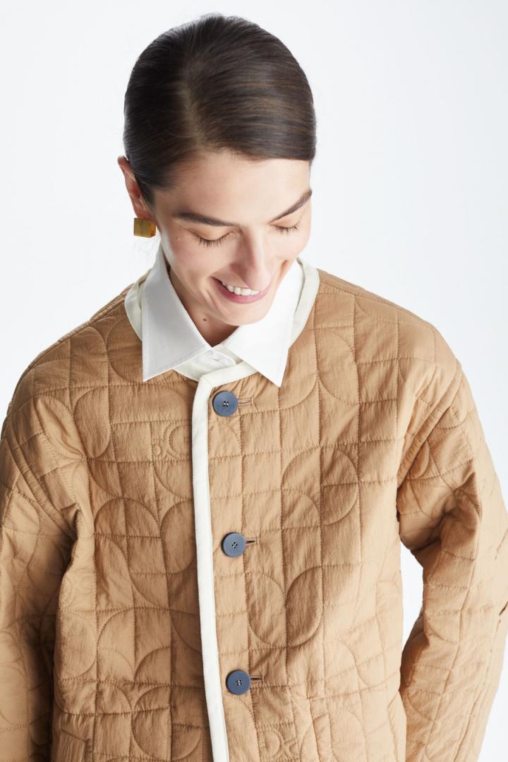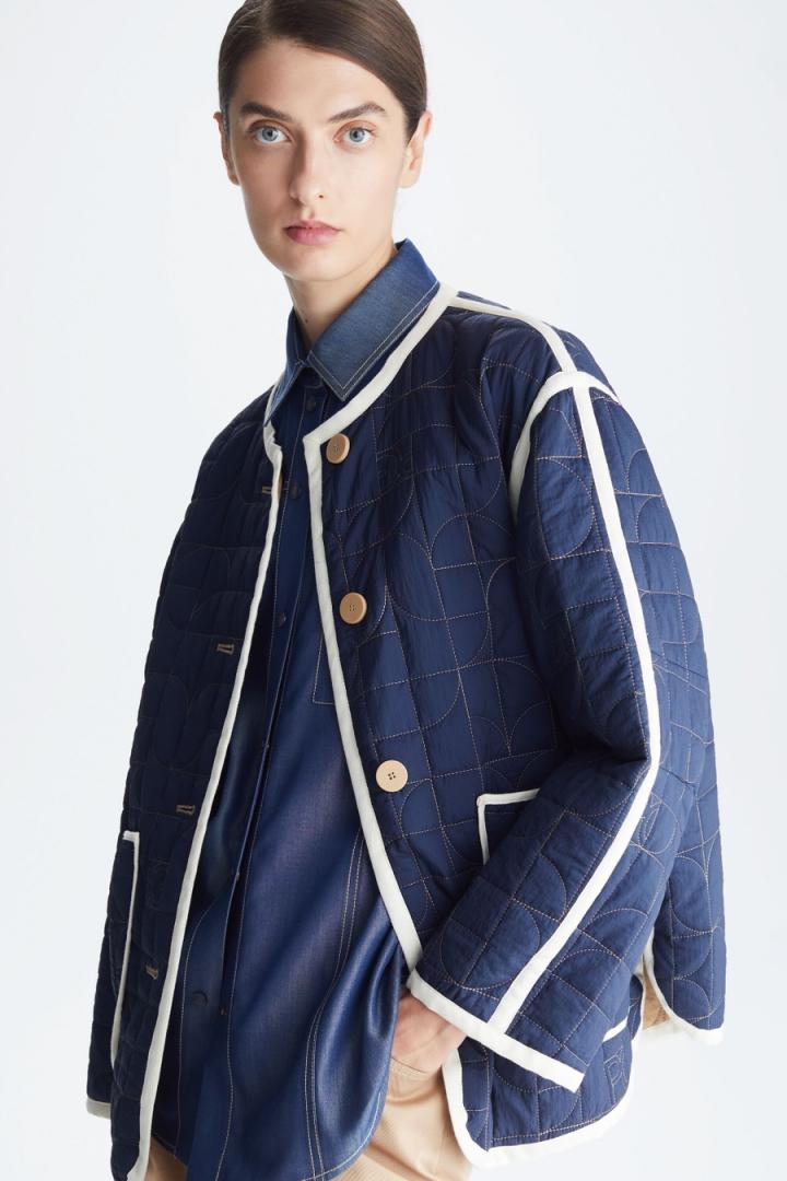 Chaquetón reversible de línea oversize en nylon con acolchado Pop Bauhaus. Cuello caja y cierre frontal de botones personalizados. Dos bolsillos parche fruncidos en el anverso y dos bolsillos de vivo en el reverso. Bajo redondeado y detalle de ribetes a contraste. La modelo mide 177 cm y lleva una talla XS.