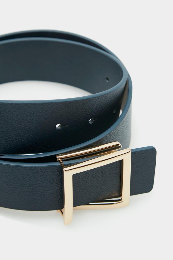 Cinturón de piel con hebilla metálica en forma de cubo. Ancho: 3,5 cm…