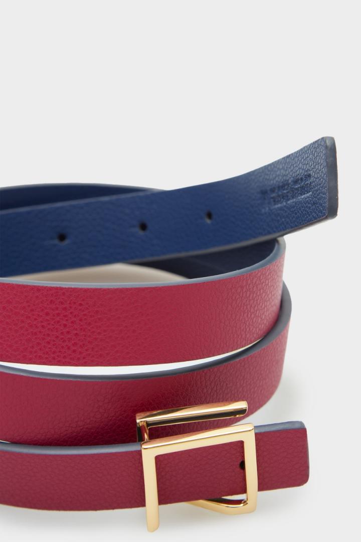 Cinturón estrecho en piel con hebilla metálica en forma de cubo troquelado e interior a contraste.