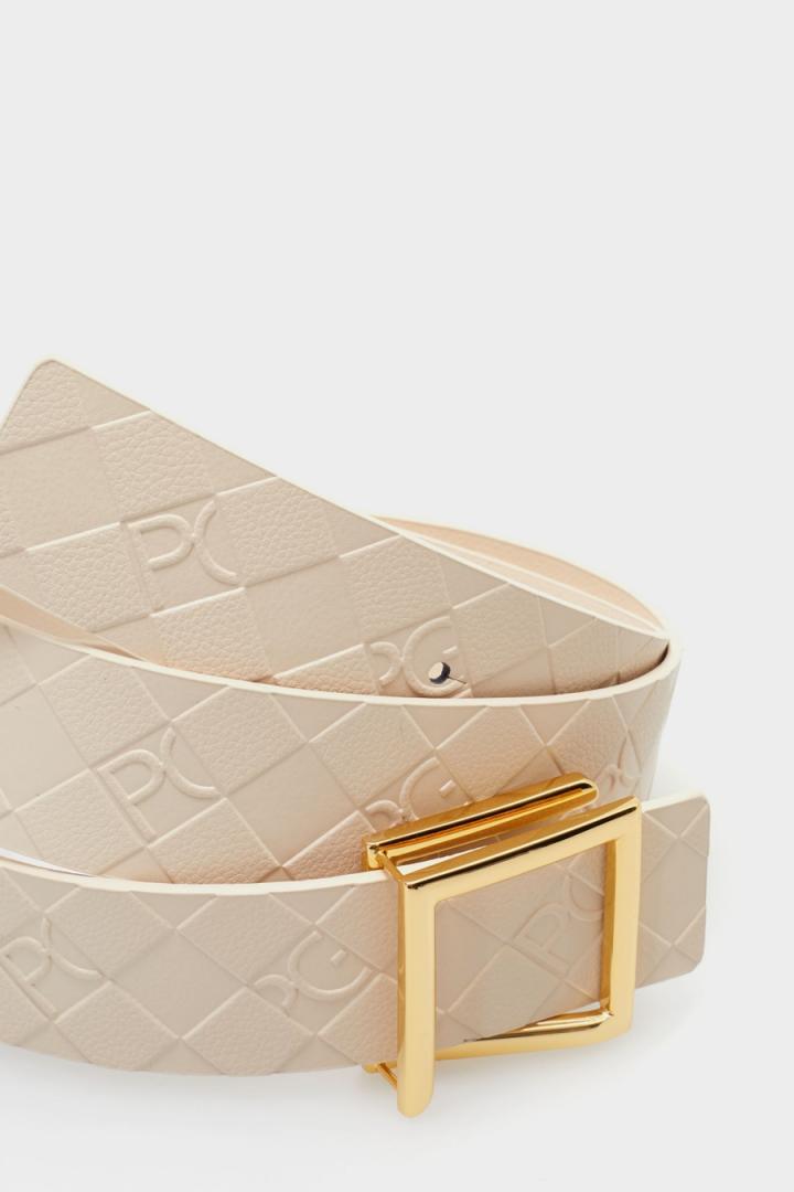 Cinturón de piel con el grabado Stamp de cubos y logos PG. Reverso de piel lisa y hebilla metálica en forma de cubo. Ancho: 3,5 cm