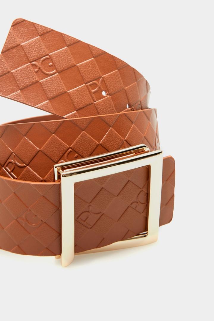 Cinturón de piel con el grabado Stamp de cubos y logos PG. Reverso de piel lisa y hebilla metálica en forma de cubo. Ancho: 6 cm