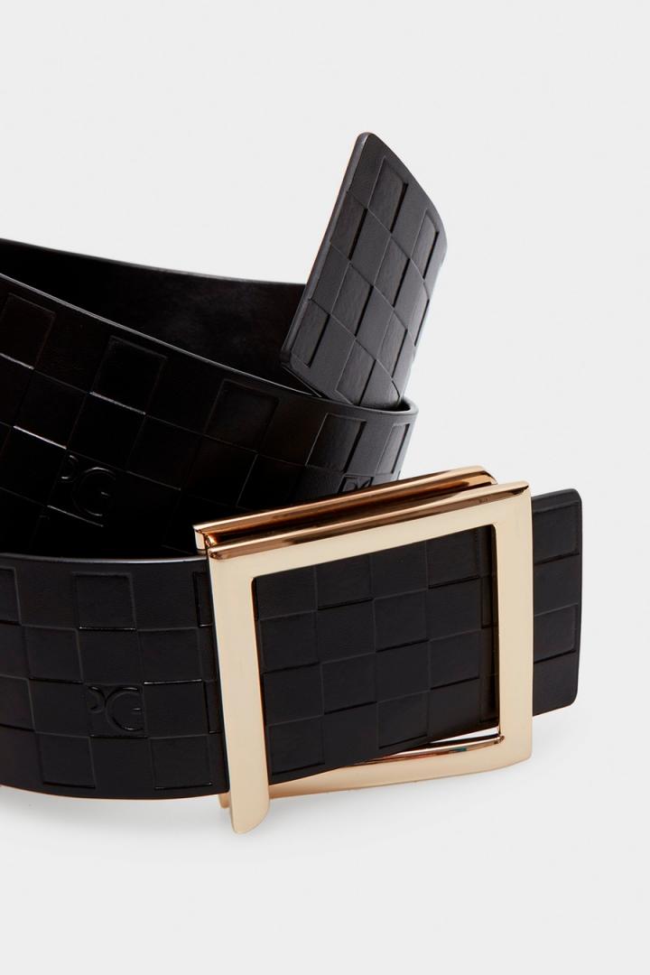 Cinturón de piel con el grabado Stamp de cubos y logos PG. Reverso de piel lisa y hebilla metálica en forma de cubo. Ancho: 6 cm