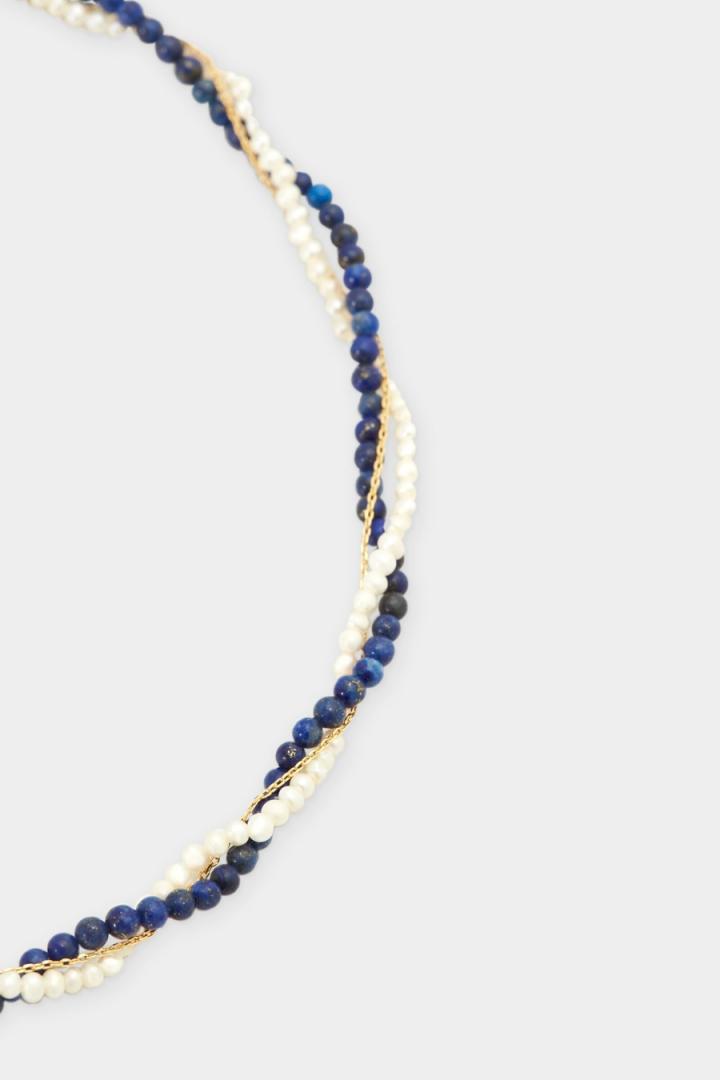 Collar compuesto por cadenas de perlas, lapislázuli y oro con diseño entrelazado. Cierre de clip.