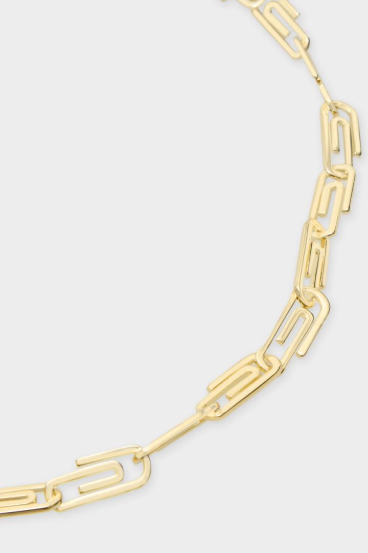 Collar bañado en oro formado por un conjunto de pequeños clips entrelazados. Detalle de cubo PG en el cierre.