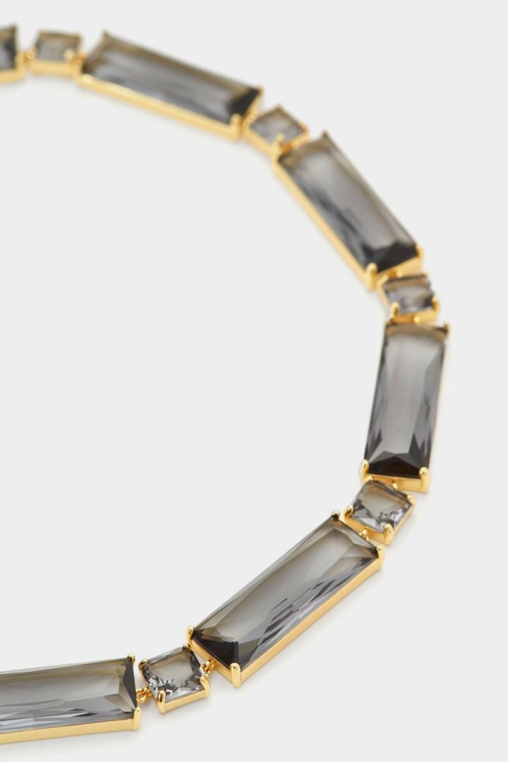 Collar bañado en oro con cristales en forma de cubo y rectángulo. Cierre tipo caja grabado con logo PG.
