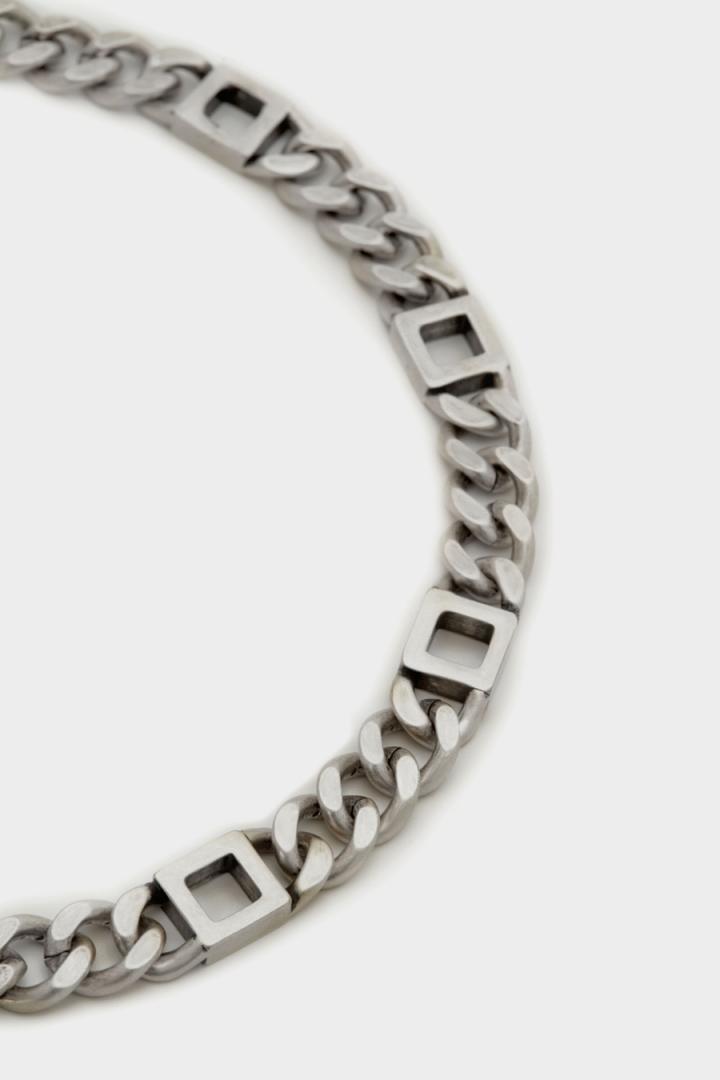 Collar bañado en plata formado por una cadena con detalle de cubos y efecto desgastado. Cierre en forma de cubos….