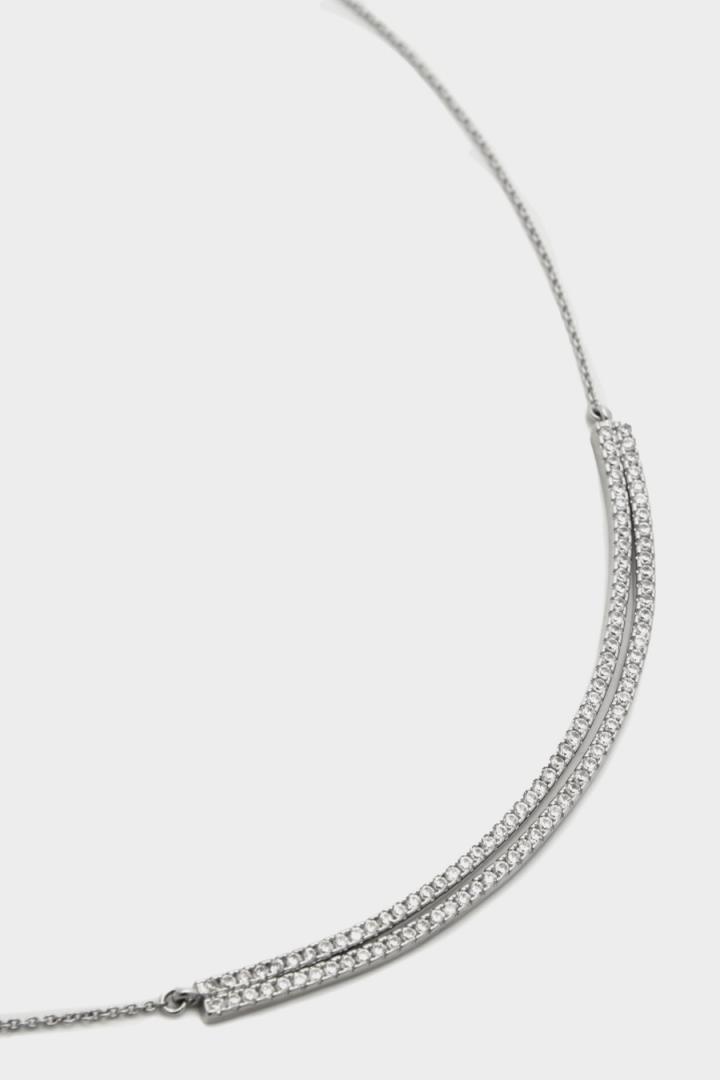 Collar de cadena fina bañada en oro y rodio con colgante en forma de doble barra curvada con cristales incrustados. Cierre de mosquetón regulable con cubo metálico y logo PG grabado.