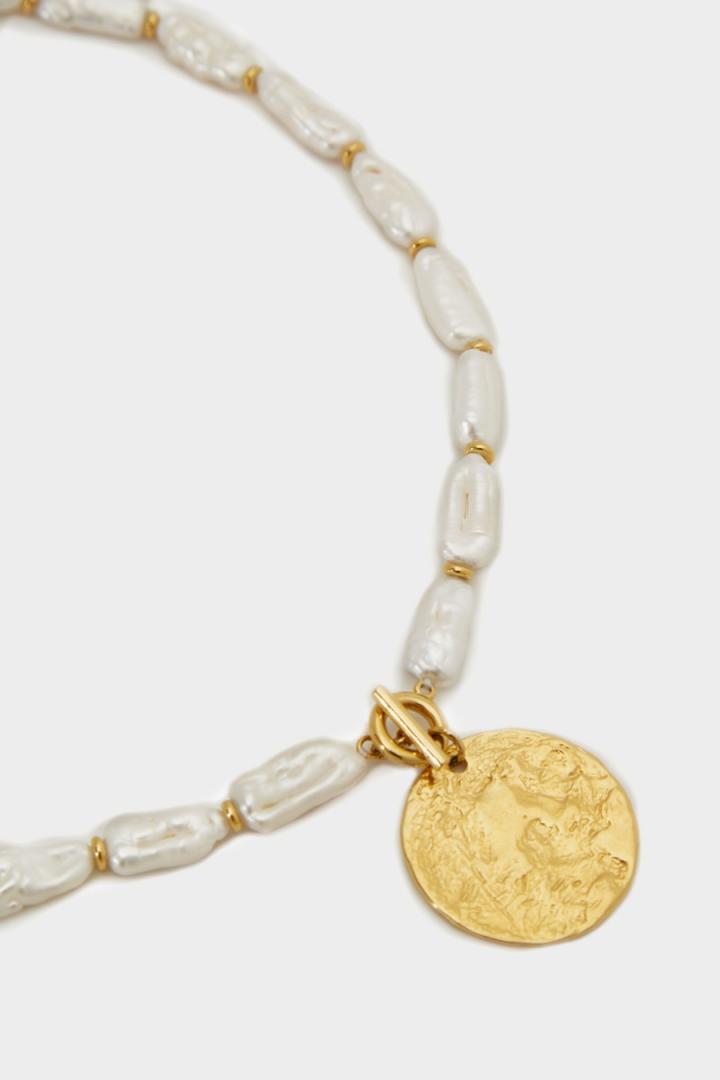 Collar formado por una cadena de perlas barrocas alargadas y una medalla bañada en oro con cierre T.