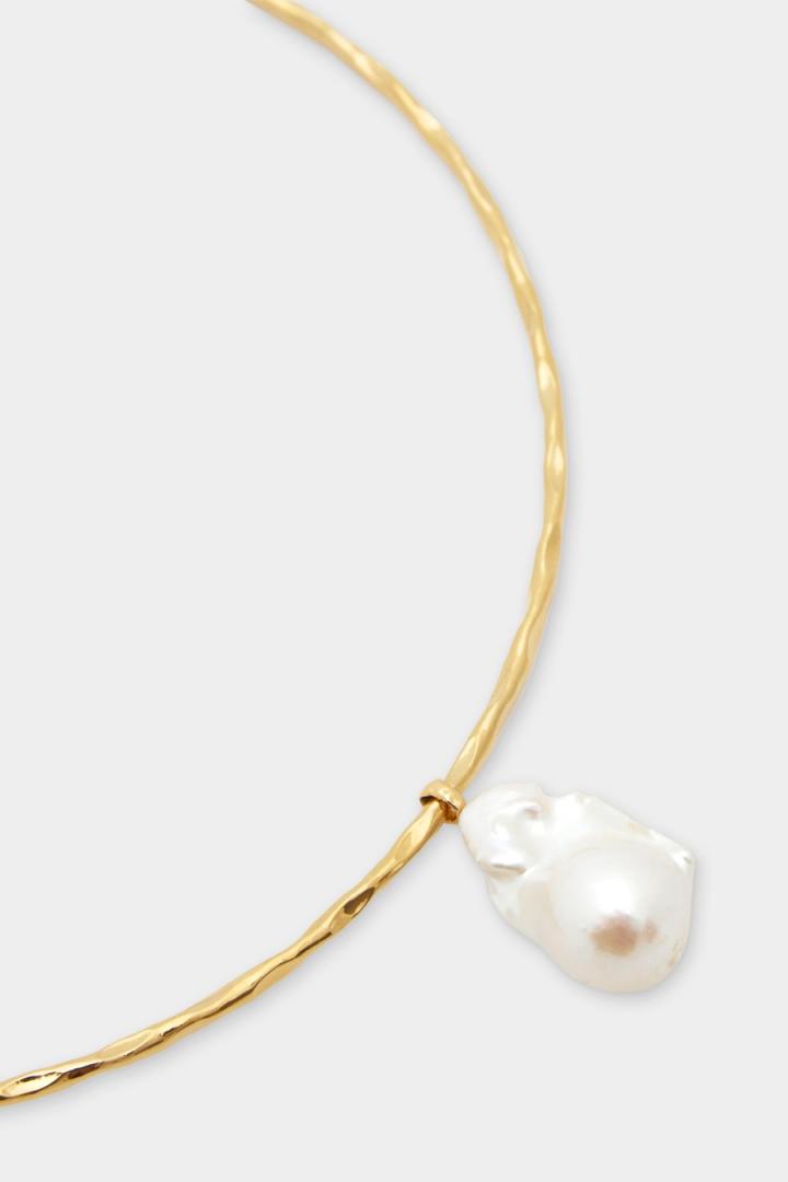 Collar rígido bañado en oro con detalle de perla barroca. Cierre de gancho.