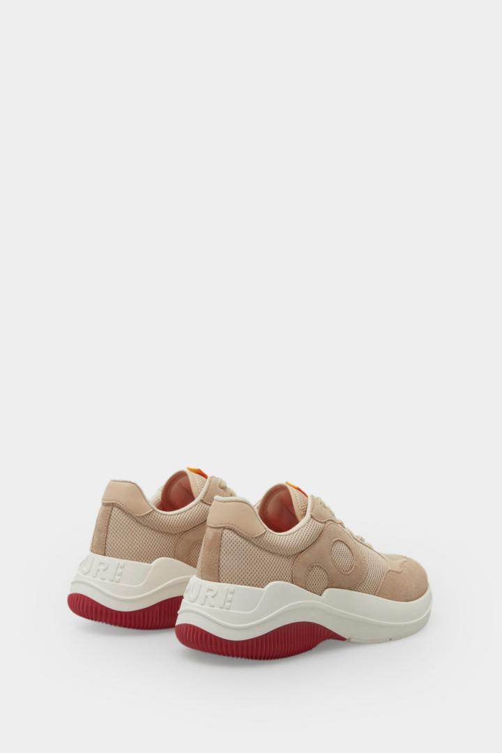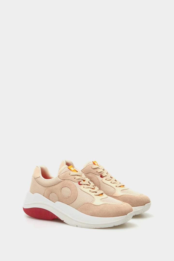 Deportiva de mujer en ante con paneles de rejilla y detalle de Ocho a tono. Detalle de logo PURE en relieve en el talón. Cierre con cordones y suela de goma grabada.