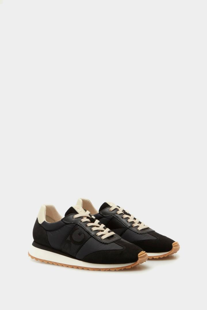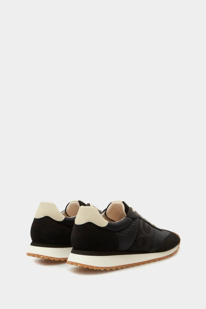 Deportiva de mujer en nylon técnico con piezas de ante a tono y detalle de cinta PG. Cierre con cordones y suela de goma con grabado geométrico….