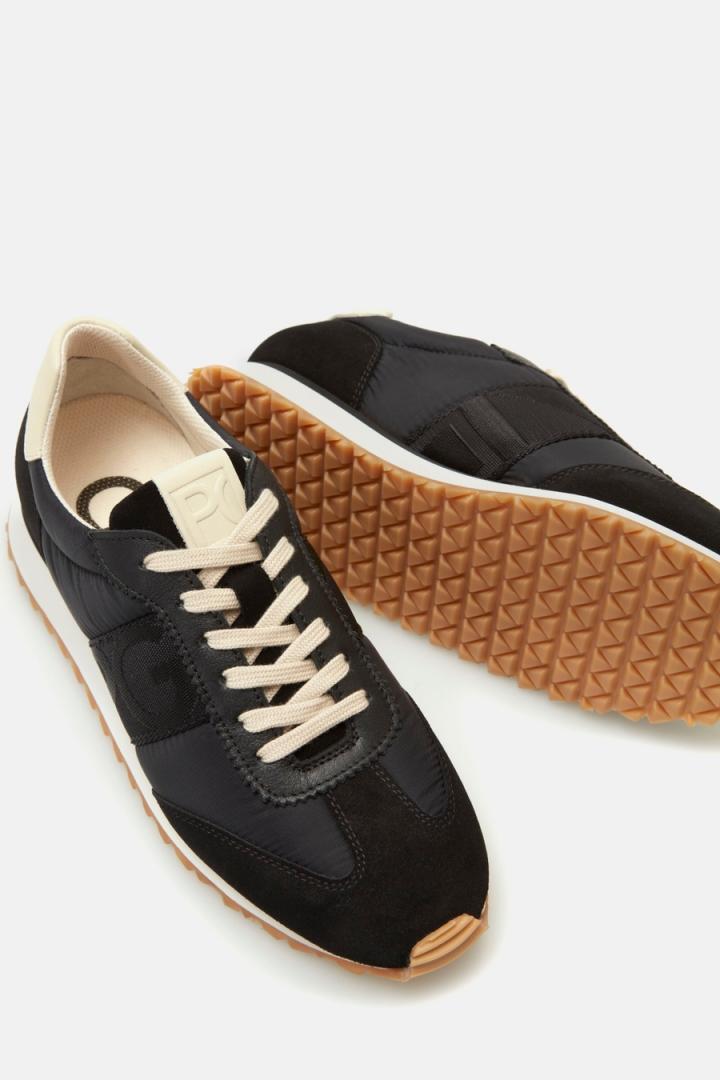 Deportiva de mujer en nylon técnico con piezas de ante a tono y detalle de cinta PG. Cierre con cordones y suela de goma con grabado geométrico.