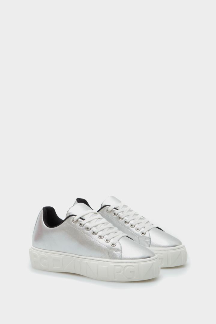 Deportiva de mujer en piel con acabado metalizado y diseño de plataforma con Cinta PG a tono. Interior a contraste, cierre con cordones y suela de goma personalizada.