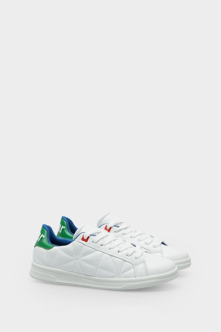 Deportiva de mujer en piel con diseño acolchado Pop Origami y detalle de talón a contraste con estampado PURE. Cierre con cordones y suela de goma personalizada….