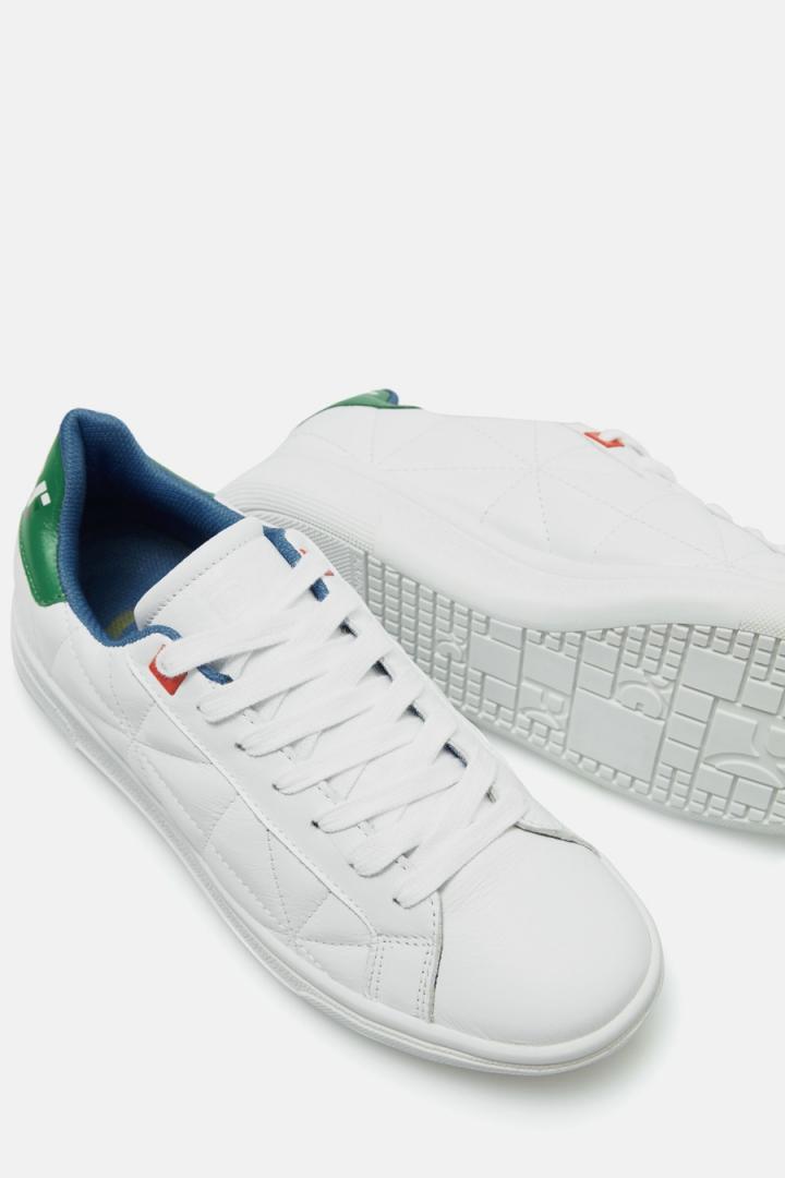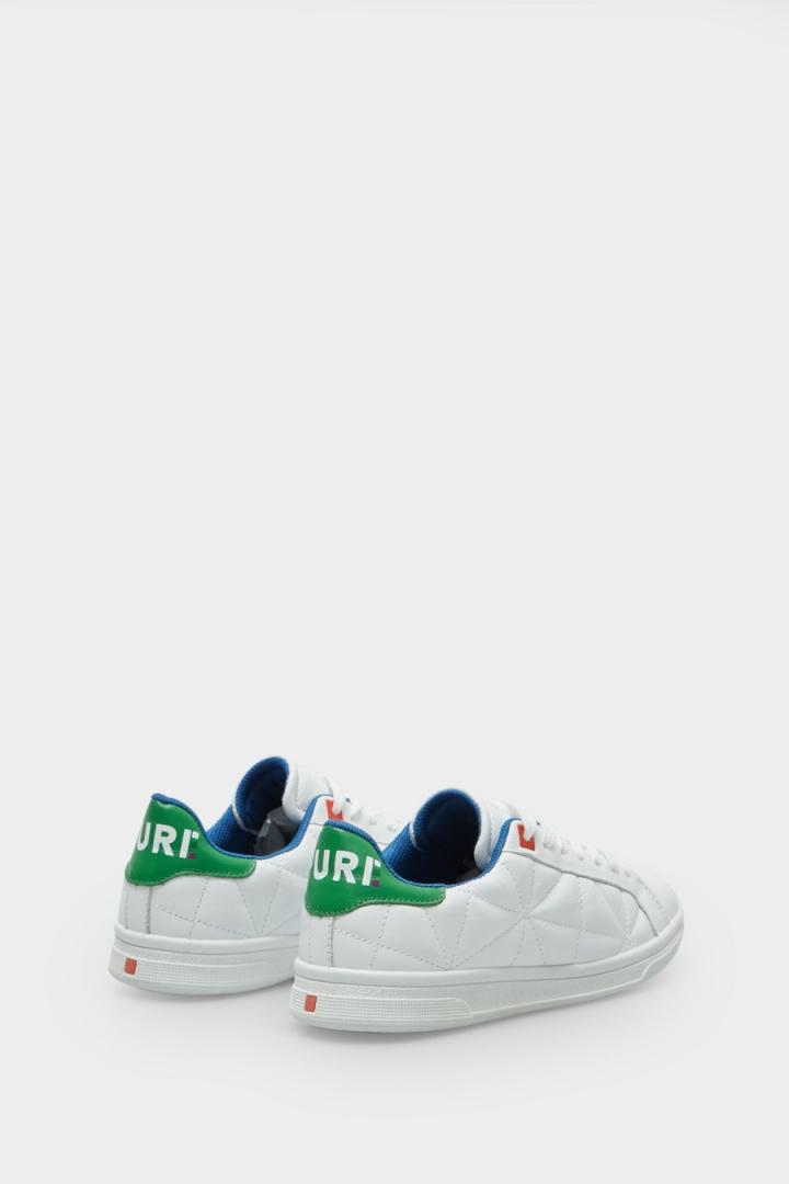 Deportiva de mujer en piel con diseño acolchado Pop Origami y detalle de talón a contraste con estampado PURE. Cierre con cordones y suela de goma personalizada.