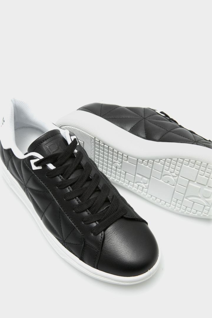 Deportiva de mujer en piel con diseño acolchado Pop Origami y detalle de talón a contraste con estampado PURE. Cierre con cordones y suela de goma personalizada.