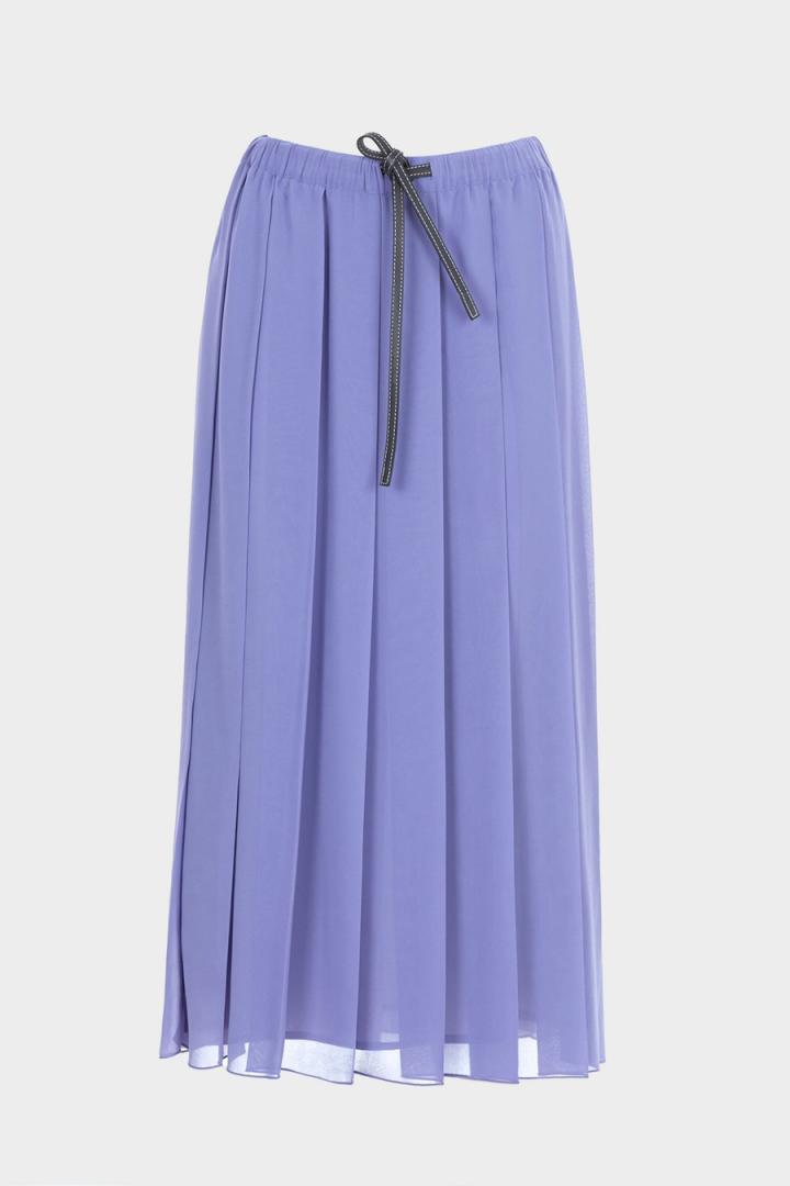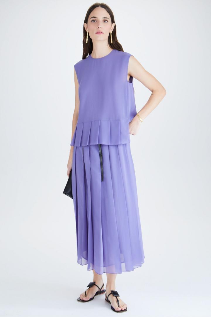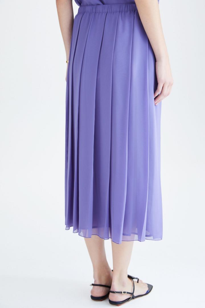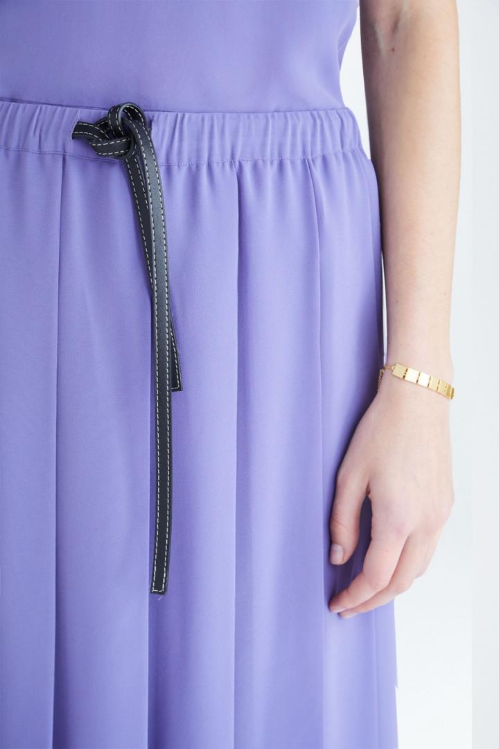 Falda midi de línea recta en crepé georgette con tablas. Cinturilla elástica, cinturón de cordón en ecopiel con pespuntes a contraste y forro completo. Tiene top a conjunto. La modelo mide 177 cm y lleva una talla S.