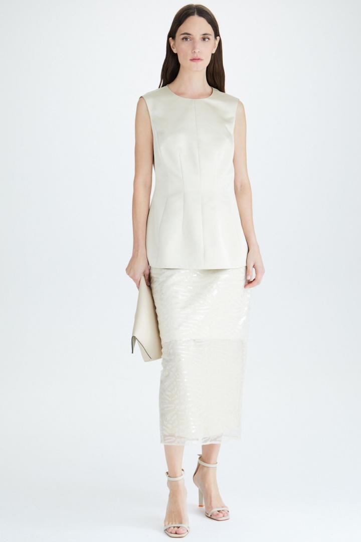 Falda midi tipo lápiz con capa interior en georgette, intermedia en tejido duchesse y superior en tul bordado con lentejuelas a tono. Cierre lateral de cremallera invisible y abertura en el bajo posterior. Tiene top a conjunto. La modelo mide 177 cm y lleva una talla 36.
