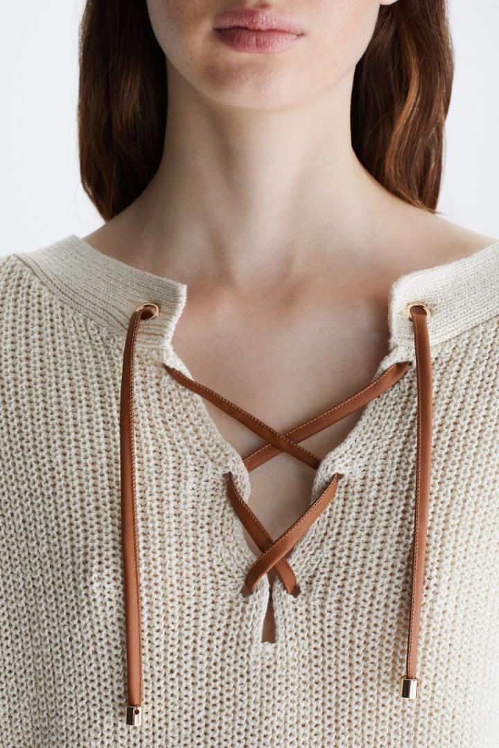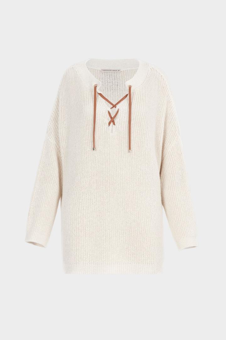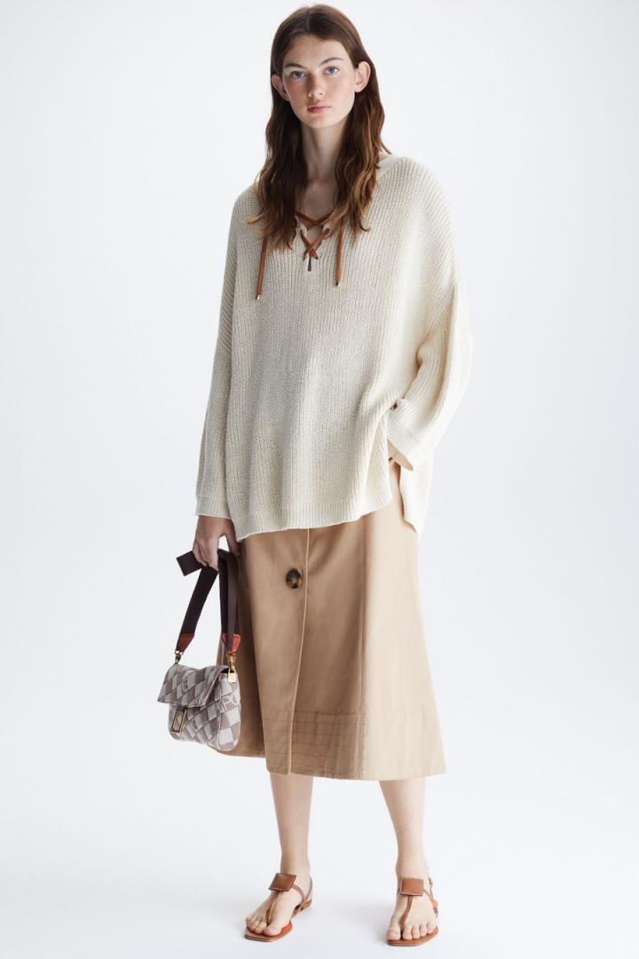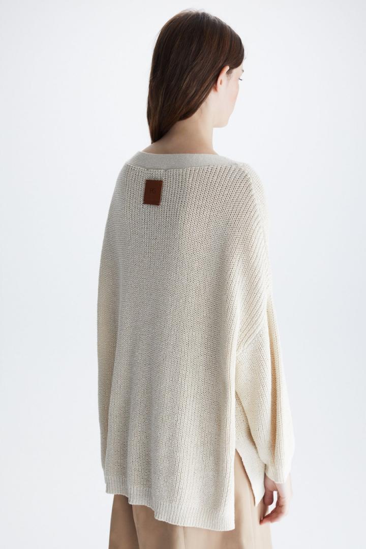 Jersey de línea oversize en punto inglés grueso de algodón con cuello panadero y cierre de cordones de piel. Hombro caído, aberturas laterales y cuello, puños y bajo acanalados. Detalle de etiqueta de piel con logo PG grabado en la espalda. La modelo mide 178 cm y lleva una talla S.