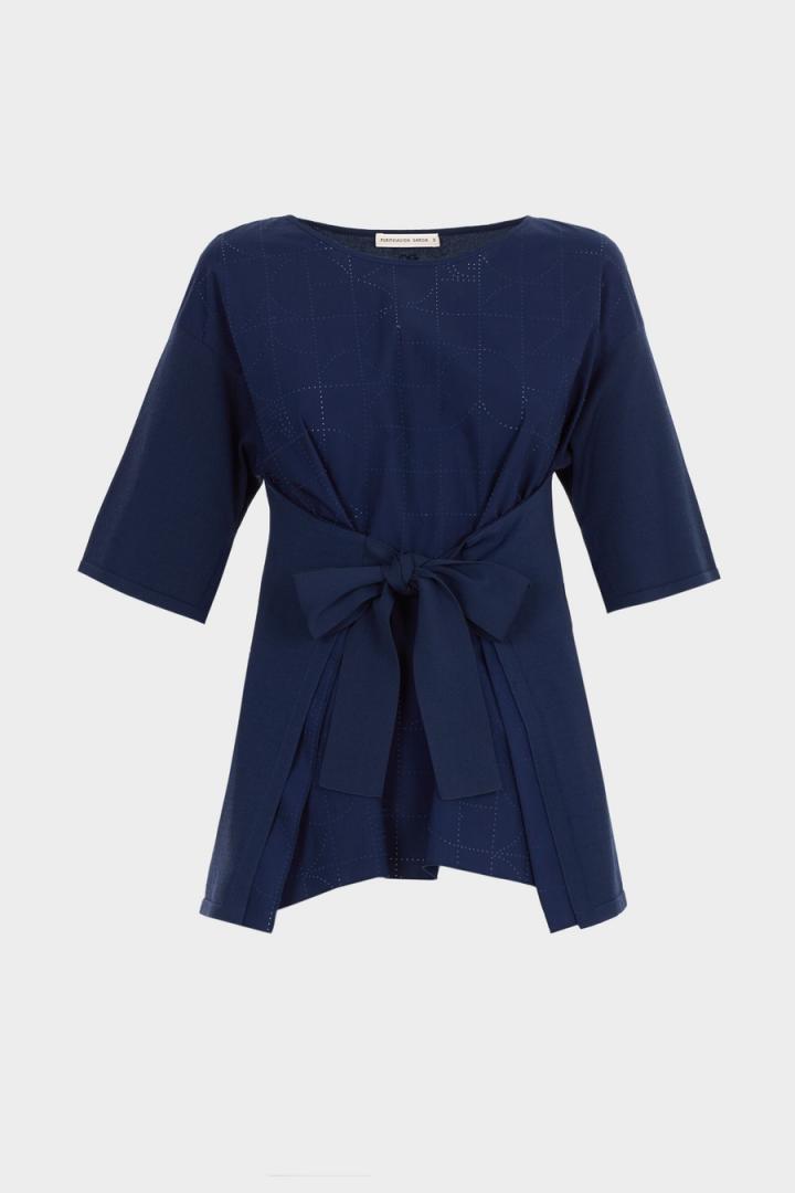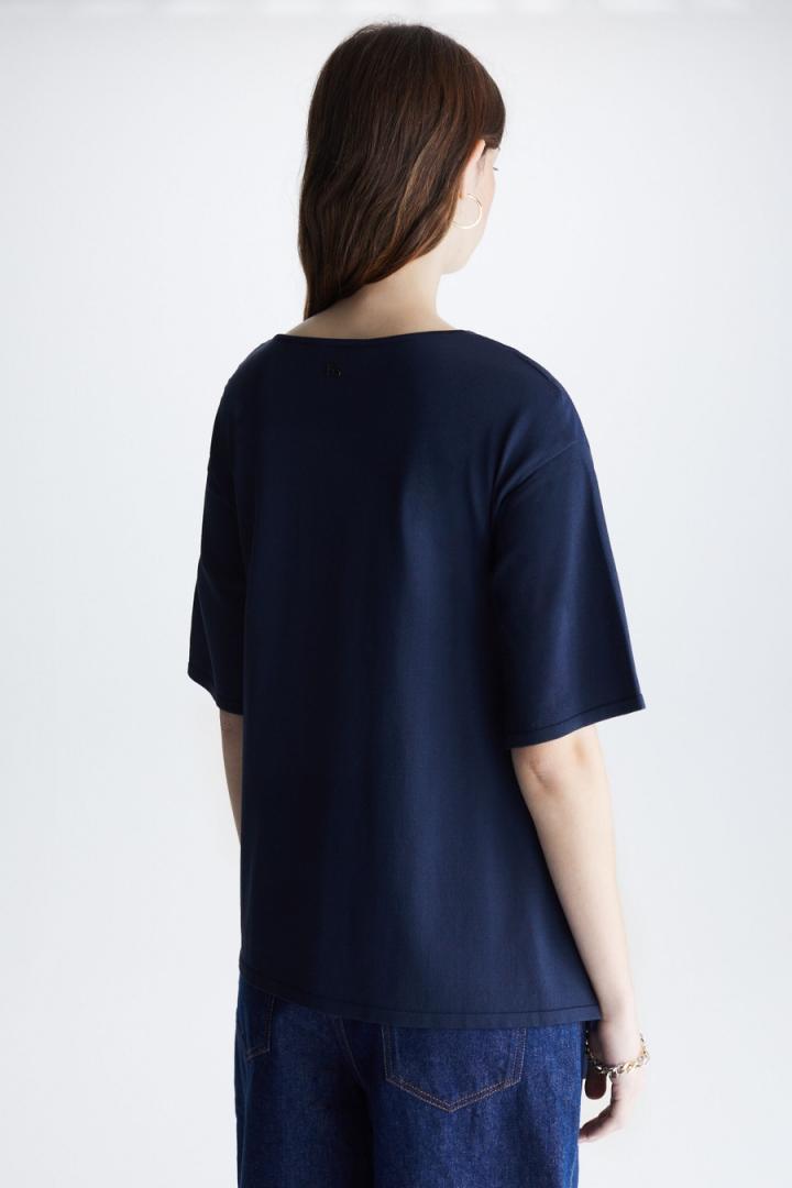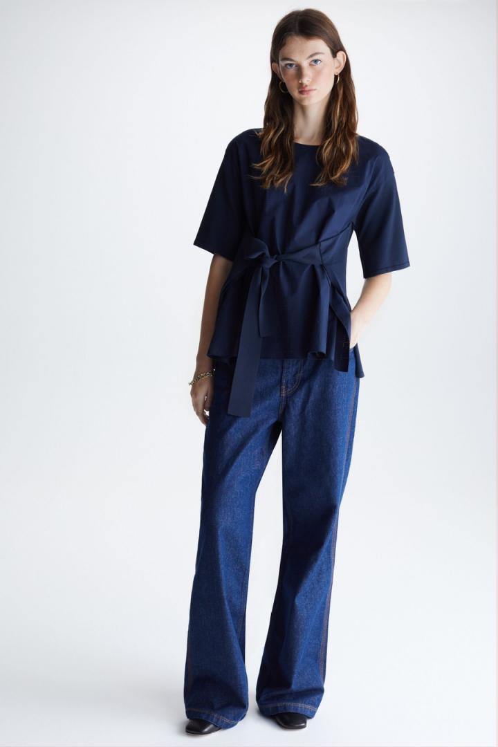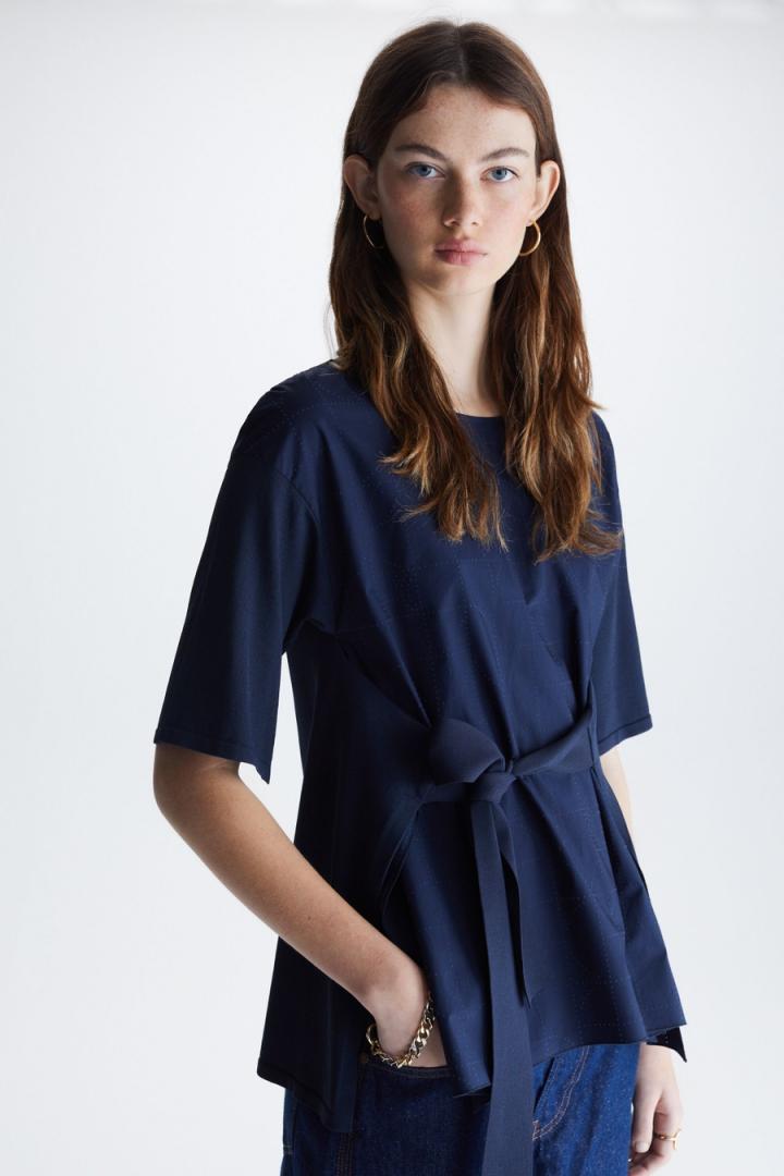 Jersey de línea evasé con delantero en popelín de algodón troquelado con diseño Bauhaus y espalda y mangas en punto stretch. Cuello barco, hombro caído y manga al codo. Bajo con volumen, tiras en punto para anudar lazo en delantero o espalda y detalle de logo PG metálico en la espalda. La modelo mide 178 cm y lleva una talla S.