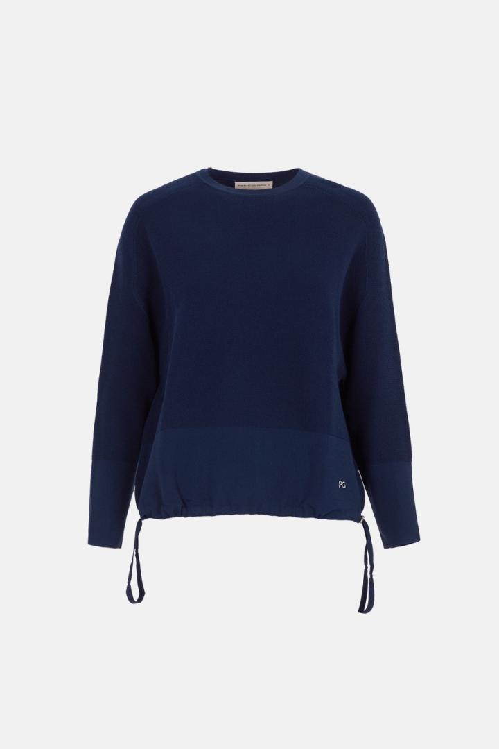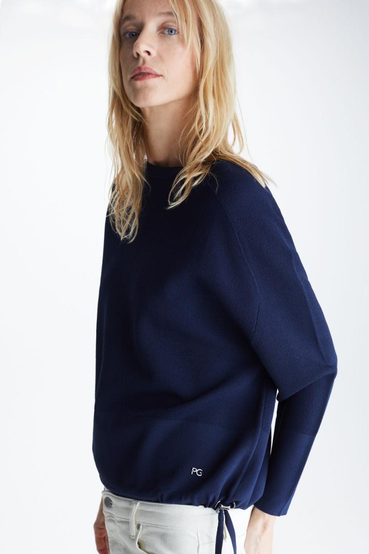 Jersey de línea oversize en punto stretch doble faz con estructura y bajo y puños anchos en punto stretch doble faz lisos. Cuello redondo, manga ranglan y bajo con fruncidor ajustable. Detalle de logo PG metálico en bajo derecho. La modelo mide 180 cm y lleva una talla S.