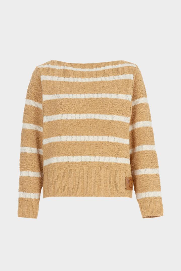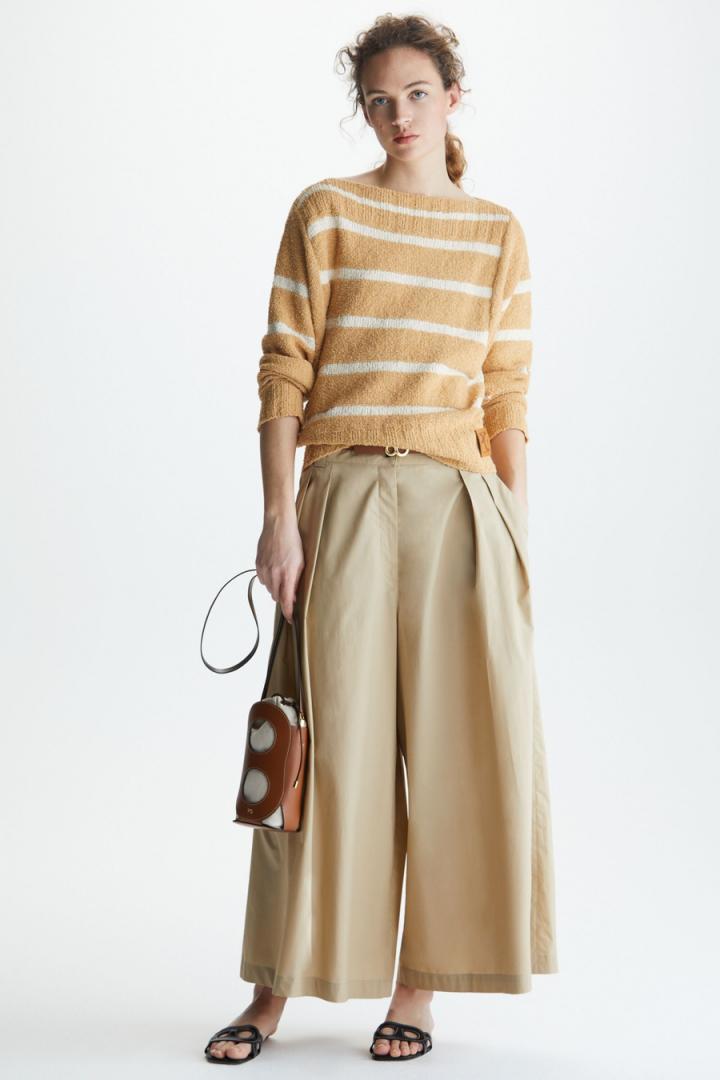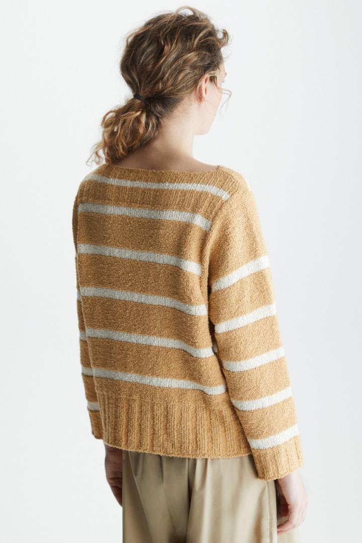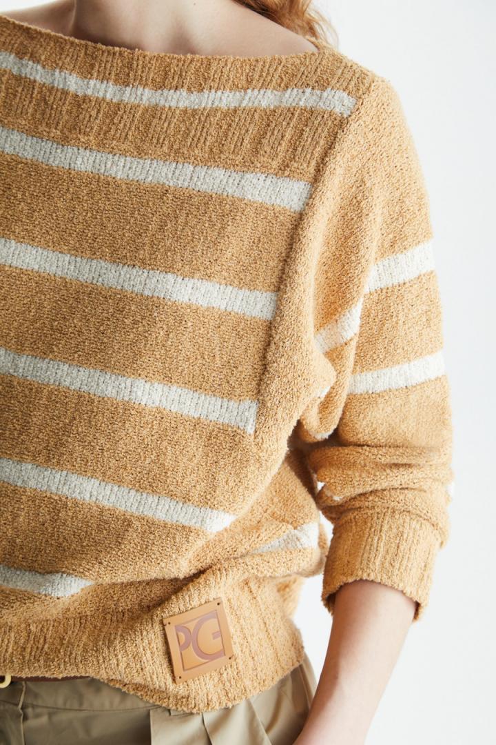Jersey de línea recta en rizo mezcla de algodón con diseño de rayas horizontales bicolor y etiqueta de piel con logo PG grabado en el bajo delantero. Cuello barco, manga larga amplia y puño y bajo acanalado. La modelo mide 180 cm y lleva una talla M.