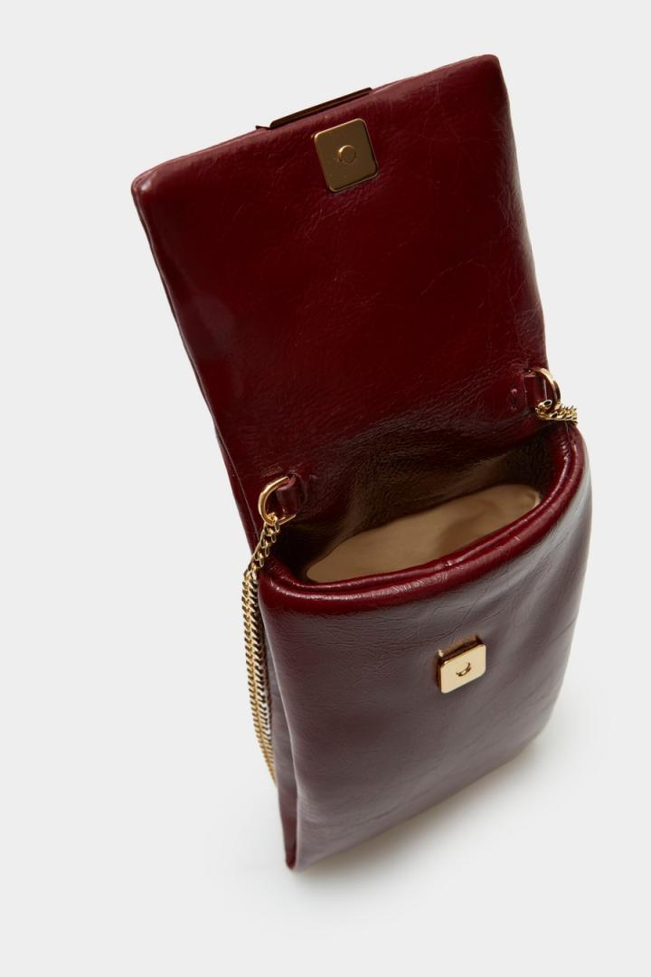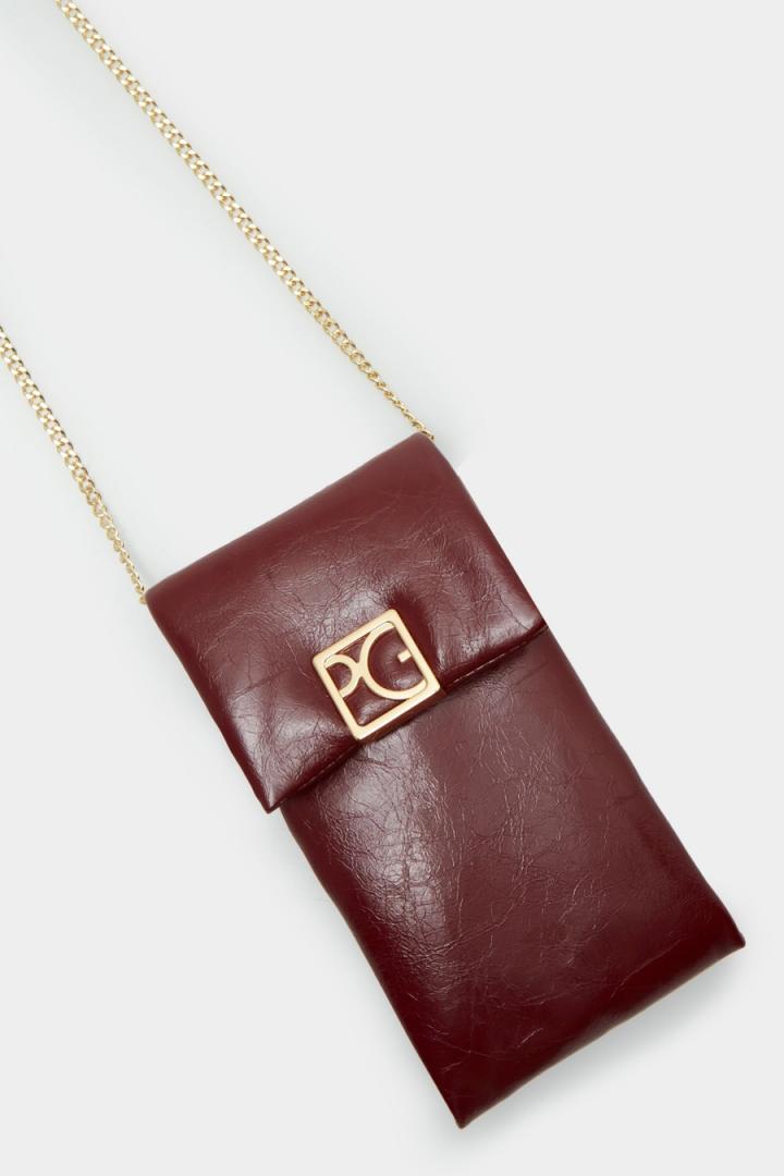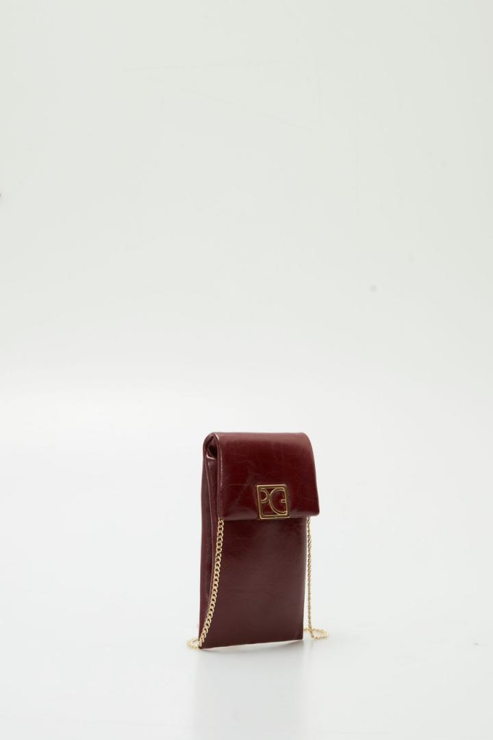 Bolso bandolera para móvil en piel. Asa bandolera de cadena y cierre de solapa con metálica en forma de cubo PG. Interior con forro completo.